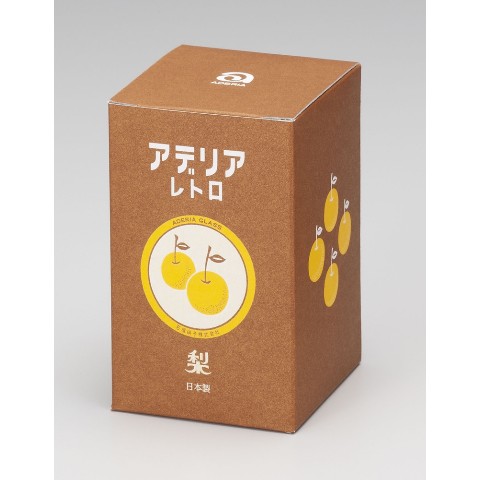素朴で優しい風合いの「梨」シリーズは、家庭用ガラス食器として昭和50(1975)年に発売されました。「アリス」や「野ばな」シリーズと一緒にアデリアのカタログに掲載された、昭和の人気商品です。当時は様ーな形状のガラス食器に展開され、かわいらしいフルーツのデザインが注目を集めました。まん丸でコロコロとした梨のプリントは、眺めているだけで心がほっと温まります。