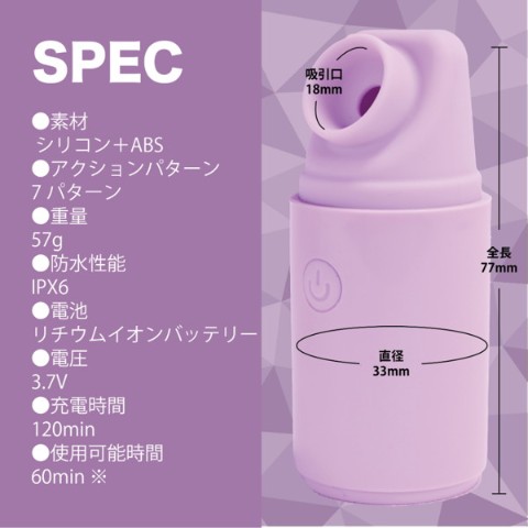 スタイリッシュな見た目で蓋付きだから持ち歩きにも便利な吸引ローター。<>上質なモーター搭載の吸引機構に高品質シリコン素材の吸引口と持ちやすいサイズ、さらにはIPX6の高レベル防水性能だからしっかり洗えて衛生的です。<>使用時は蓋を外して底面に付けられます。どこでもキャリー出来る自分だけのプレジャーアイテムです。<>3.7Vリチウムイオンバッテリー搭載で120分で満充電、最大60分の連続使用が可能です。(※使用環境により大幅に増減します。)<>多彩で実用的な7パターンの吸引を演出します。<>見た目と実用性を兼ね備えたMYPLEASUREGOODSです。