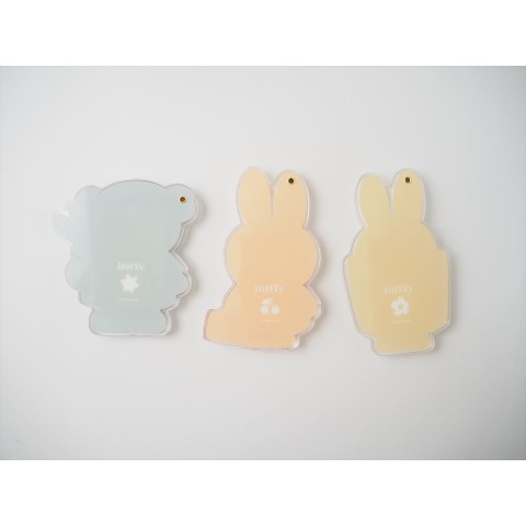 ミッフィーとボリスのアクリルダイカットシリーズです。バッグの中にもスリムに収まるスライド式のミラーです。全3柄 SIZE:W62~84×H90~108mm 素材:本体:アクリル