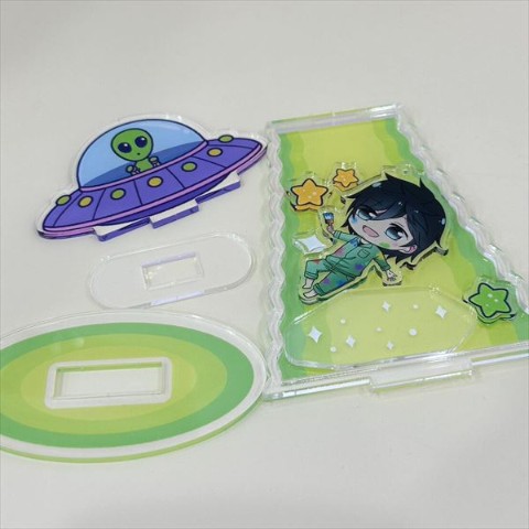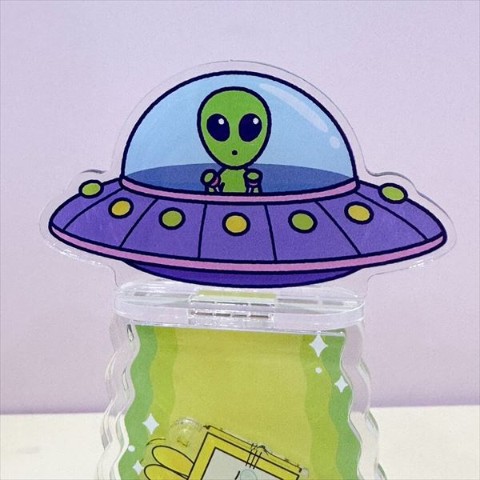 にじ丸商店の人気アクリルフレーム「推しを入れるあのやつ」にジェイホビ研究所限定デザインが登場しました。推しのアクキーを中に入れると、あ~れ~!UFOにアブダクション(さらわれる)されちゃうよ!アブダクションといえばの牛も付いてるのでそのまま飾って怪し可愛いです!あなたの推しのグッズを入れて飾って楽しんでください!(中の空洞は厚さ3mmまで対応可能、高さ最大9.7cm程度までのアクスタが入ります。)