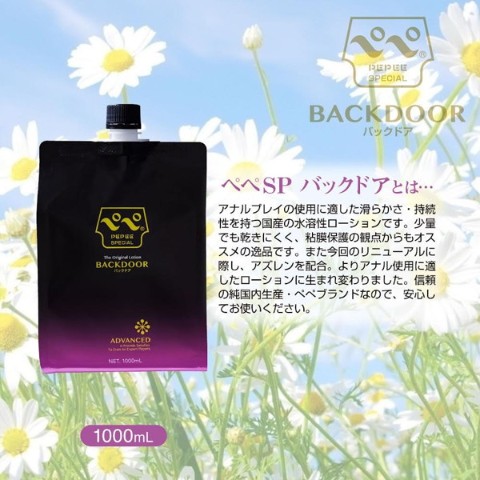 人気ナンバーワンのバックドア用ローション「ぺぺSPバックドア」。詰め替えにも便利、たっぷり使える大容量サイズで登場です。何と言ってもバックドアプレイで大切なのは「適した潤滑性」と「粘度の持続性」ではないでしょうか。それらを高いレベルで兼ね備えていた前作ですが、今回はそこにアズレン(※)を配合しました。また1000mLの大容量サイズなので、詰め替えなどお得に使えます。高粘度、かつ優れた持続性・潤滑性のぺぺSPバックドア。バックドアプレイを楽しむのであれば押さえておくべきローションの一つです。(※)アズレンとはカモミールなどに含まれる成分です。抗炎症作用があり、粘膜を保護して丈夫にする効果があると言われています。