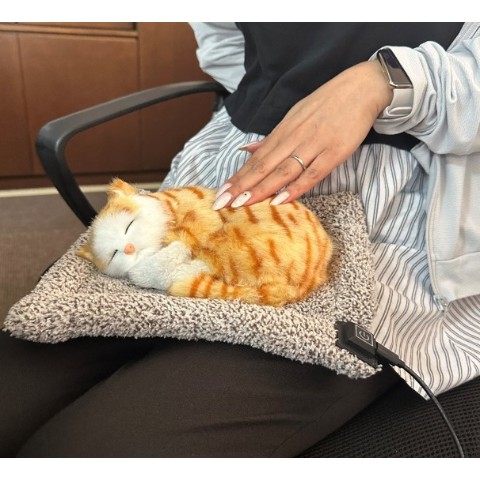 クッションの中にはUSB式のヒーターが入っているので、スイッチONでじわじわと温かくなり、膝の上に載せるとまるでペットの温もりが伝わってくるような感覚です。
