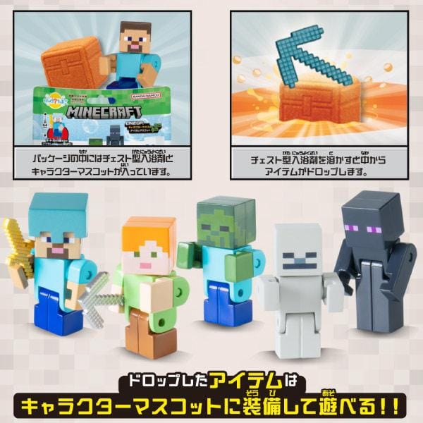 チェスト型入浴剤から装備品が出てくる(=ドロップする)というゲームでの世界観を体験でき、出てきた装備品は別添のキャラクターマスコットに装備して遊ぶことができる仕様!