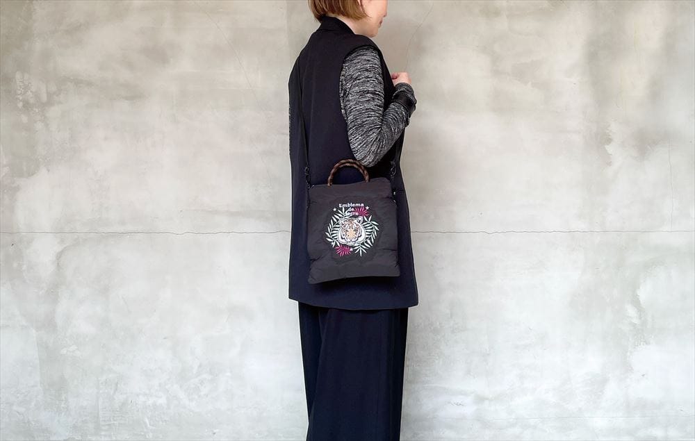 アニマルモチーフを刺繍で表現した インナーに羽毛を使用したサコッシュ。 デザインが目をひく、アイコントート。