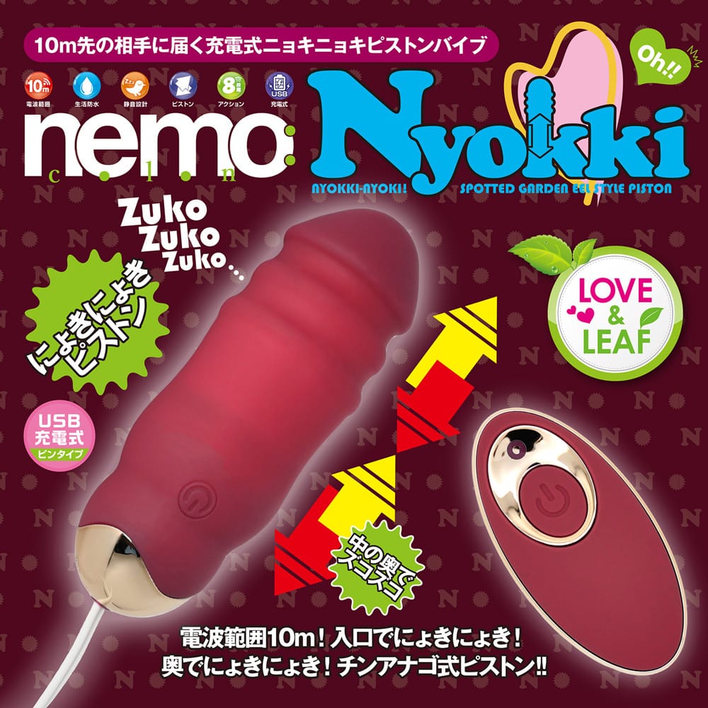 ニョキニョキニョッキ!かわいすぎるピストンバイブが生まれました。かわいいイモムシみたいな「nemo:Nyokki(ニョッキ)」で楽しもう。小さいけれどパワフルにニョキニョキ伸び縮みする動作。バイブ振動しながら伸び縮みするから、広範囲にジンジン広がる刺激がたまらない。手のひらサイズでバイブ振動とズコズコ摩擦で同時刺激。リモコンでもローター単体でも操作可能。8種類の動作パターン。本体の表面はソフトシリコンで肌ざわりもすべすべ。・USB充電式・フル充電で最大40分可動・生活防水。≪ご使用上の注意事項≫1:リモコン付属の電池と予備の電池は動作確認用です。お早目に新しい物にお取替え下さい。2:振動させていなくてもローターは電波受信の為に電池を消費しています。使用後は必ず電源をOFFにして保管して下さい。3:リモコン用電池の絶縁体を取り外してからご使用ください。4:ローターを無理に引っ張ったり縮めたりすると故障する恐れがあるのでおやめください。