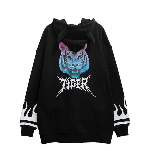 【LISTEN FLAVOR】 虎と炎のツノ付き 肉球ジップパーカー BLACK