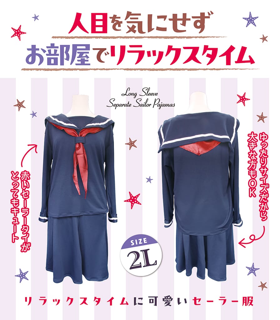 おとこの娘用2Lサイズ 女子校生になった気分を味わえるセーラパジャマ 着心地のいい裏起毛カットソー素材 リラックスタイムにかわいいセーラー服 人目を気にせずお部屋でリラックスタイム リアルなセーラー服のようなセパレートタイプ 胴周りに余裕のあるストレスフリー仕様 ゆったりサイズだから大きな方もOK 赤いセーラータイがとってもキュート おとこの娘用2Lサイズ 身長 170~180cm 胸囲 92~100cm 胴囲 94~102cm 品質:ポリエステル95% ポリウレタン5%