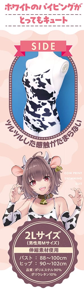 牛柄コスチュームで、野生の魅力を解き放て! あなたの中のメス牛が疼きだす 正統派スクール水着タイプ ホワイトのパイピングがとってもキュート ツルツルした感触がたまらない ピチピチのフィット感 最高の着心地が体験できる 伸縮性抜群! 2Lサイズ(男性用Mサイズ) 伸縮素材使用 バスト 88?100cm ヒップ 90?102cm 品質:ポリエステル90% ポリウレタン10%