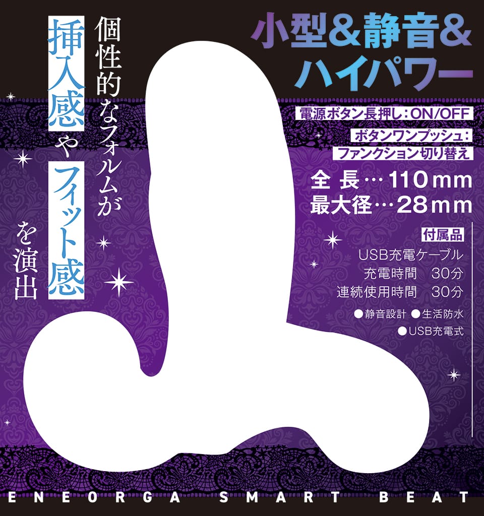 初心者でも安心の小型電動エネマ 高級シリコン素材使用 ハンドレスでドライオーガズムに導く 滑らかなシリコン素材が生み出すソフトな質感 個性的なフォルムが挿入感やフィット感を演出 充電式ハイパワーモデル 小型&静音&ハイパワー 10パターンの振動があなたを刺激する モーターの振動がダイレクトに伝わる ボタン長押し:電源ON/OFF ボタンワンプッシュ:ファンクション切り替え 静音設計 生活防水 USB充電式 全長:110mm 最大径:28mm 付属品 USB充電ケーブル 充電時間 30分 連続使用時間 30分