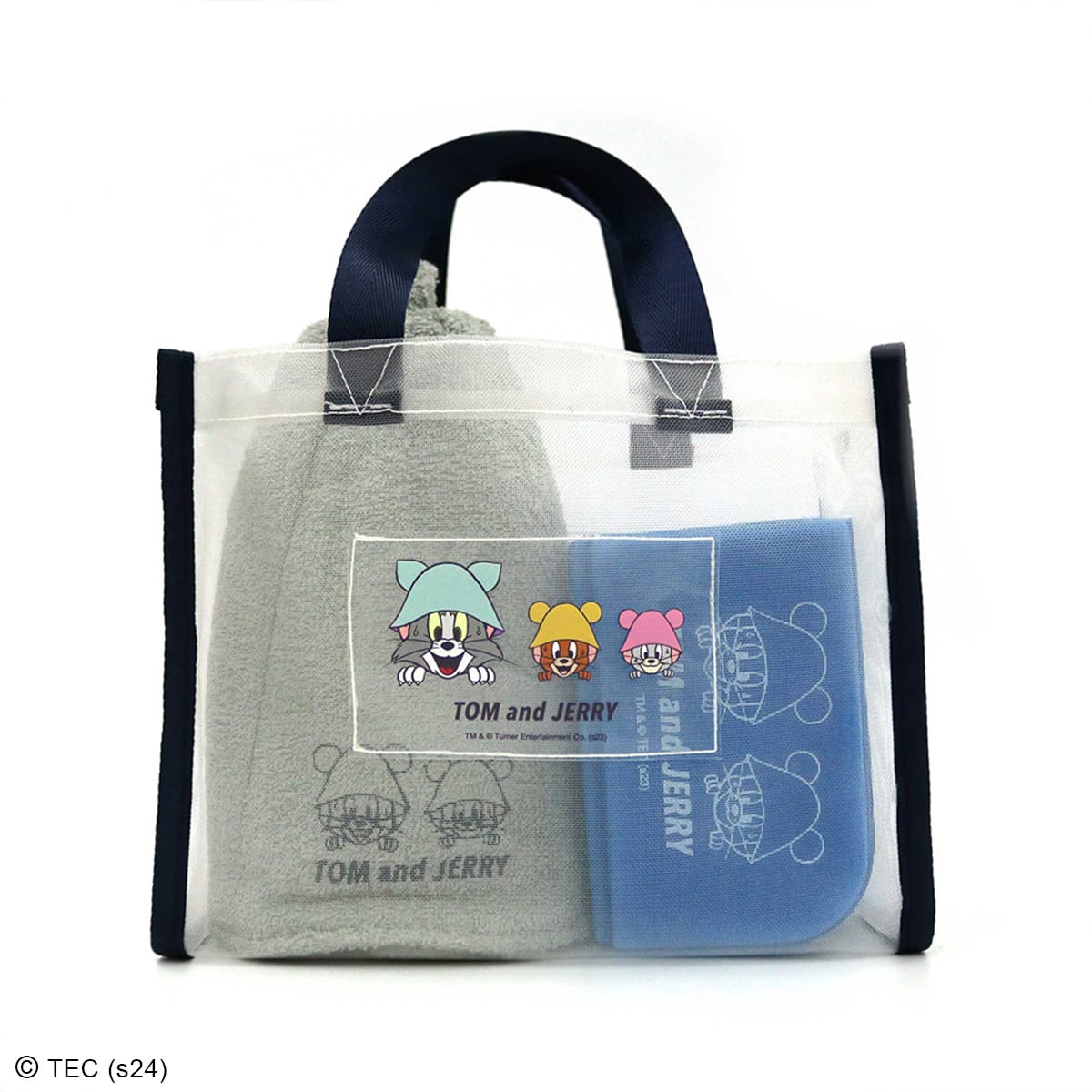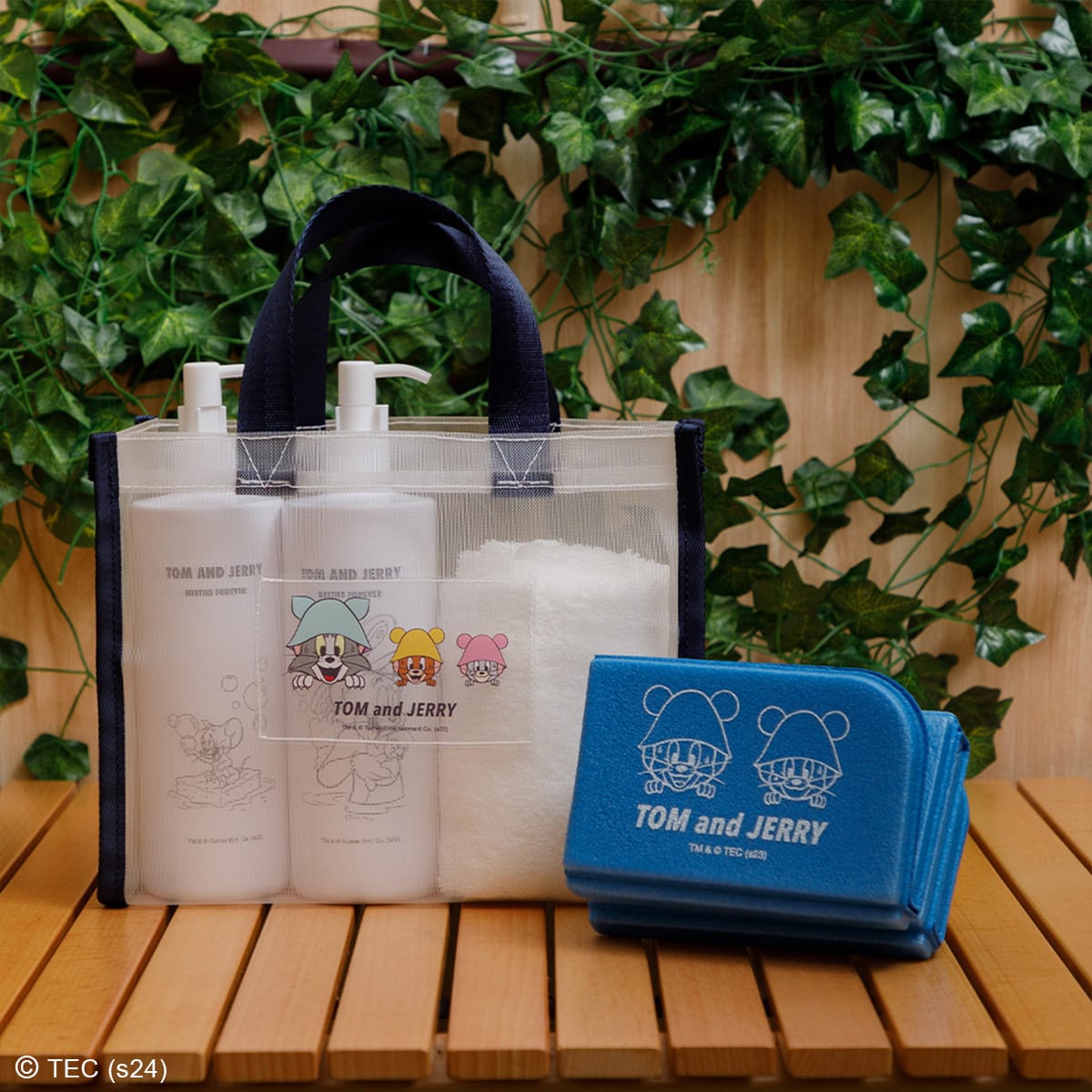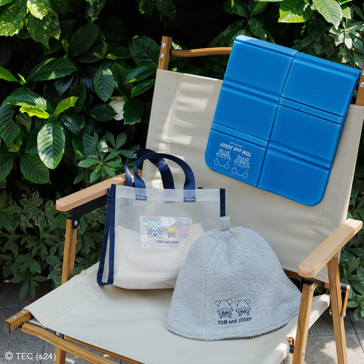 サウナハット・サウナマット・サウナバッグの3点セット。トム、ジェリー、タフィーがサウナハットをかぶってサウナを楽しんでいる特別デザイン。
