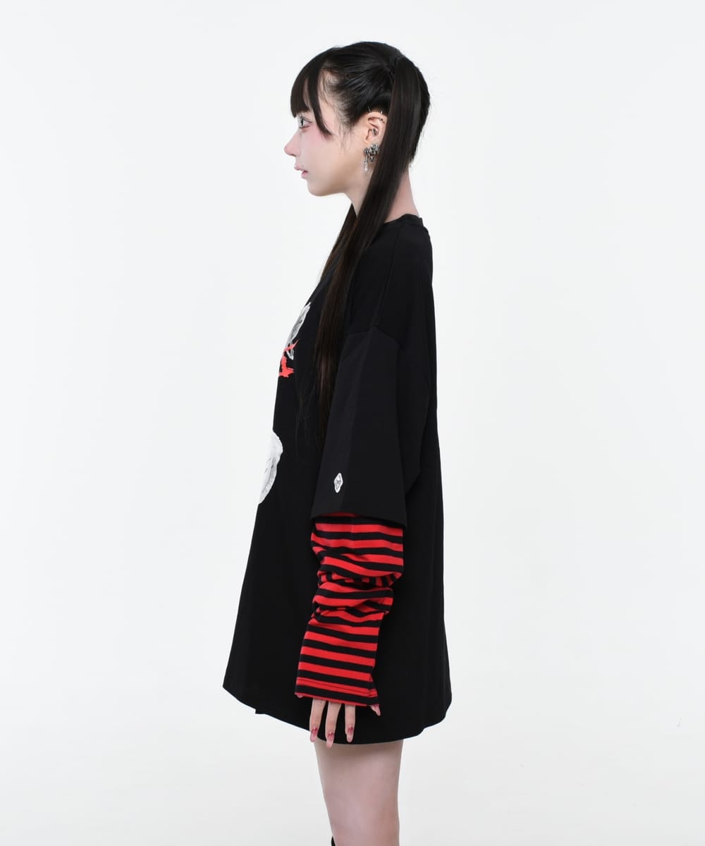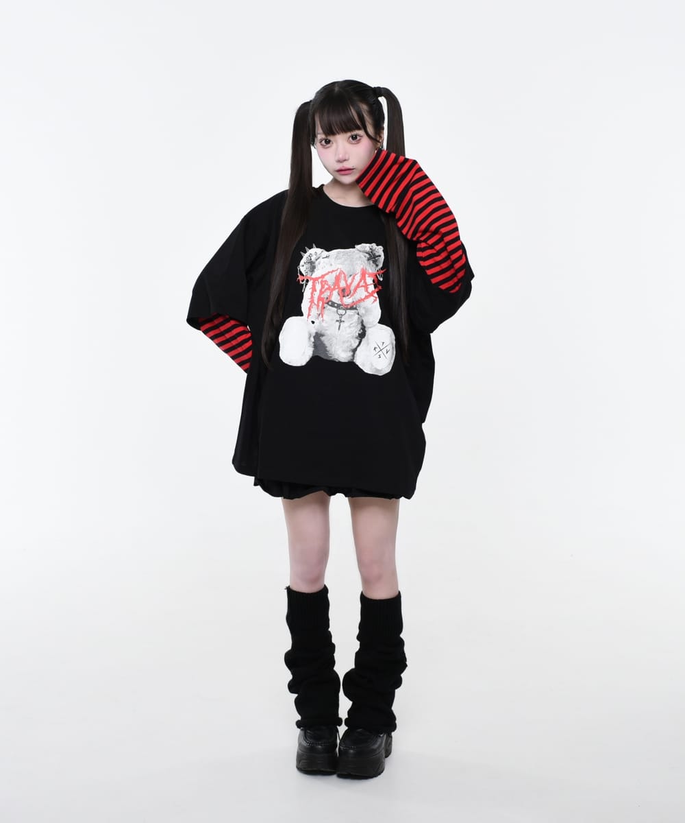 袖をボーダー生地でレイヤードにしたロンTとなり、メタルロゴとともにロックなクマをフロントにプリントしています。