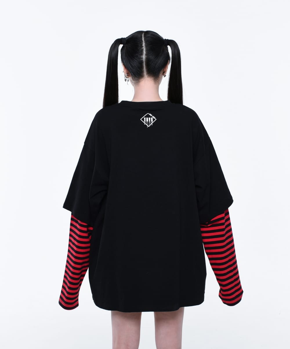 【TRAVAS TOKYO】くまプリントレイヤードボーダーL/S Tee【Black/Red】