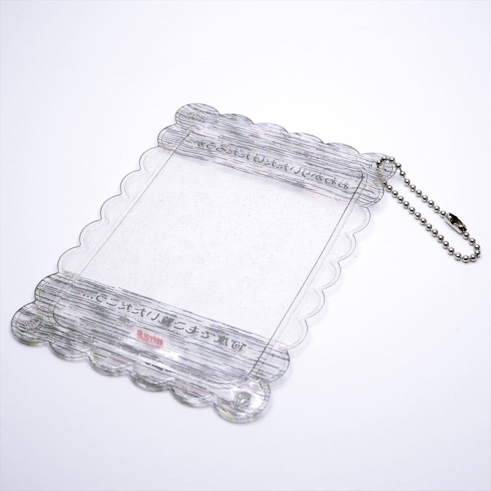 ※カードを長期間入れっぱなしにしていると、カードの印刷がフォトホルダーに移る可能性がございますのでご注意ください。 ※製品の四隅のパーツは指で押すと外れます、ボールチェーンを通したい部分のパーツを外してお使いください。