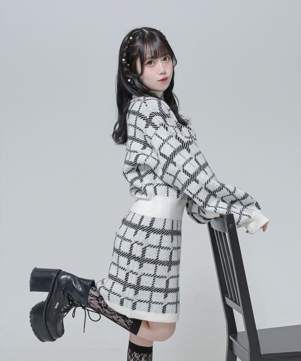 【TRAVAS TOKYO】チェック柄ジャカードニットワンピース White/Black