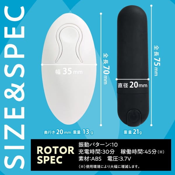 バルクサイズ:ローターH75x直径20mm、リモコンH70xW35xD20mm