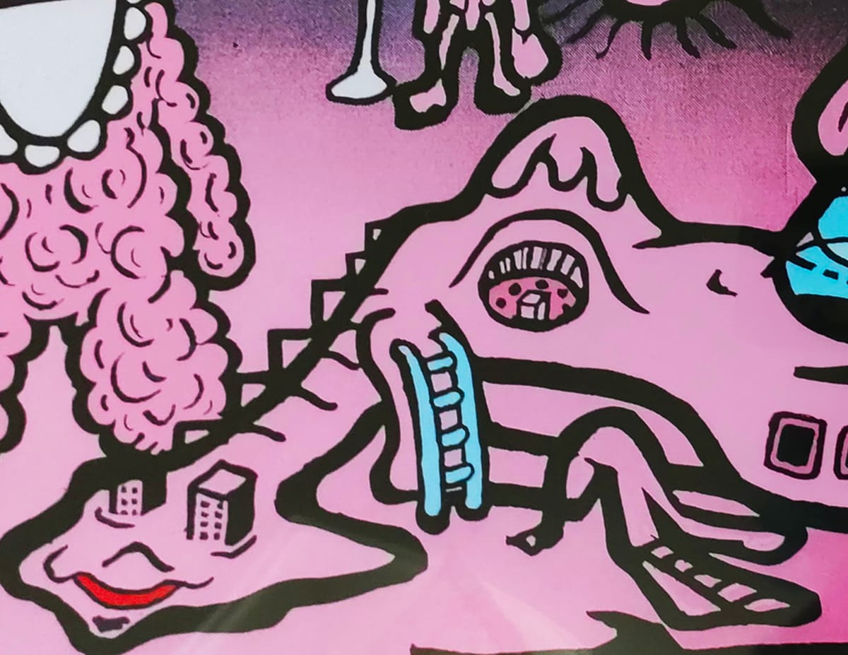 澁谷のセンター街を「センター害CITY]として描き、new yorkで放映されたアニメーション「pornoinvader game]から抜粋した
