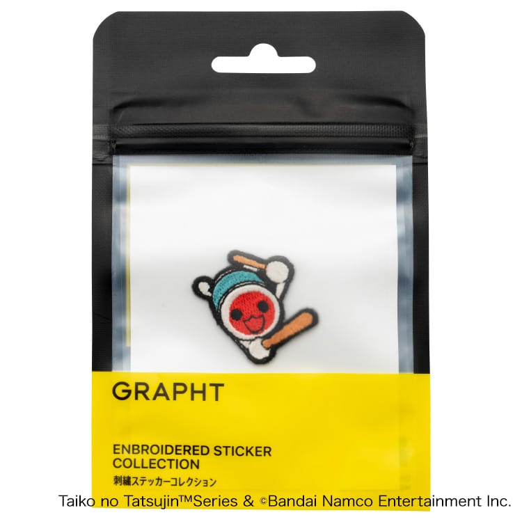 「太鼓の達人」タイトルロゴを始め、大人気キャラクターのどんちゃん(和田どん)とかっちゃん(和田かつ)を刺繍ステッカーで再現。
