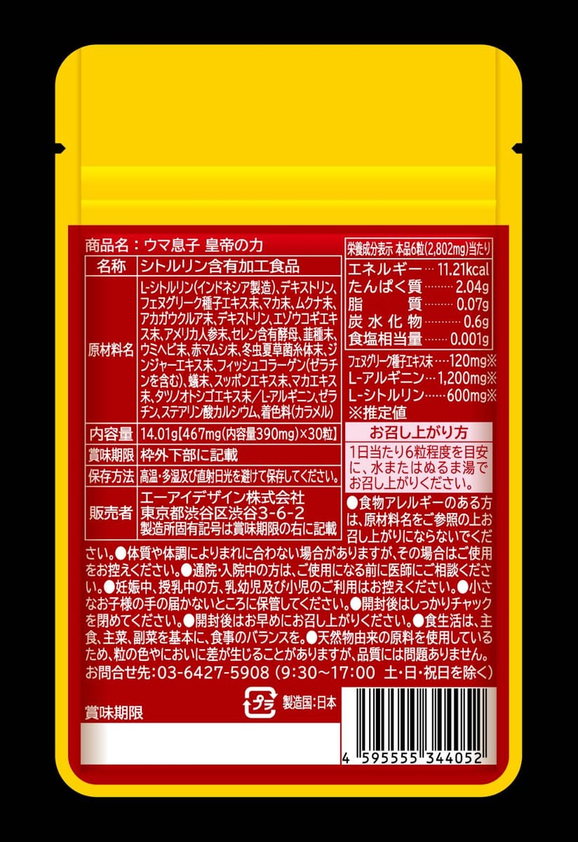 L-シトルリン、L-アルギニン。フェヌグリーク種子エキス、マカ、ムクナ、アカガウクルア、エゾウコギエキス他 賞味期限:製造日より2年