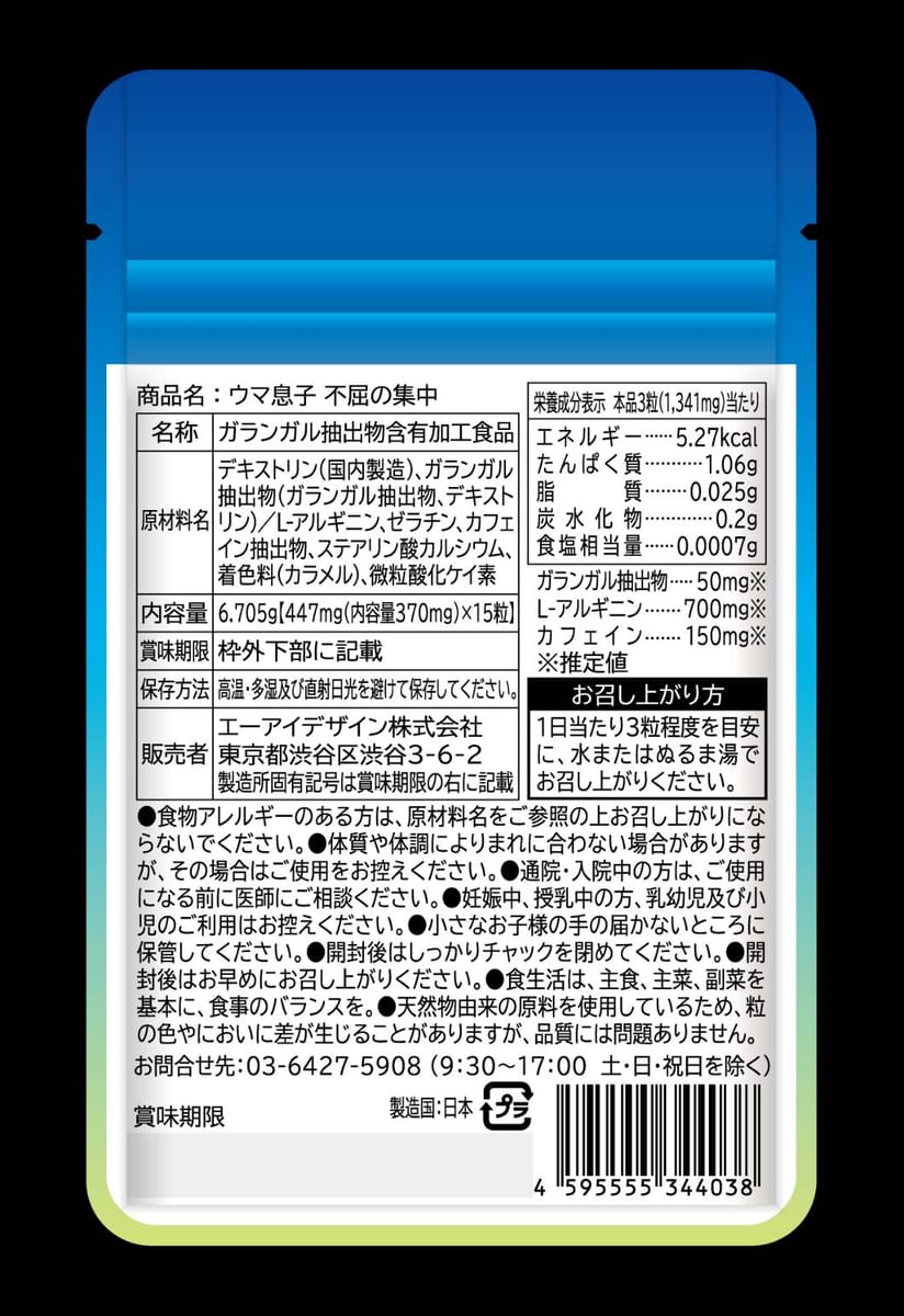 ガランガル抽出物、L-アルギニン、カフェイン抽出物、ステアリン酸カルシウム 賞味期限:製造日より2年