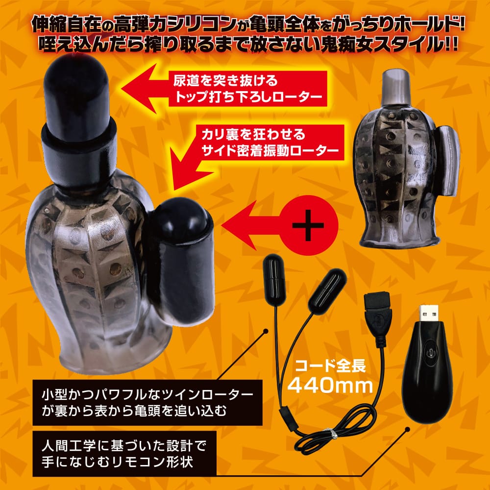 M男向け亀●サック第2弾は従来のカ●裏に加えて先端部から打ち下ろす[尿●発狂ローター]を配置!凄まじい暴振動にたまらず腰ガックガクな悶絶仕様!静音設計ではありませんがめちゃ強力バイブです!さらにフィット感を増した高弾力シリコンに亀●をホールドされツインローターでカ●首と尿●を責められまくり!USBを挿すだけで充電可能、ワンボタン操作で使用OK!人間工学に基づいた設計で手になじむリモコン形状はアナタのオナ活にフィットすること間違いなし!防水仕様で洗えるのでお手入れも簡単です!(USBソケット部分を除く)【暴振動MENU】1マッタ~リ2鬼ジコられ3死んじゃう4絶巧のテク5XTCリッチ6驚愕うぅぅ7トルネード8ランダム9極上体験10変速シコシコ11強弱自在12ビックラッシュ13亀●がバグる14焦らしのち激15何も言えねぇ16発射直前推奨17ショックウェーブ18ドM専用19読めない振動20疾風迅雷