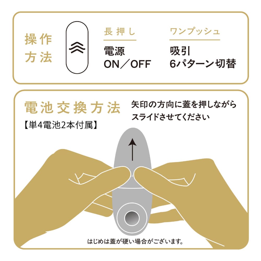 はじめてのセルフプレジャーにおすすめの吸引ローターです。吸引パターンは6パターンを搭載。お好みのパターンで楽しめます。使用後にさっと洗えて清潔を保てる防水機能付き。動作音が気にならない静音設計です。シリコン製のやわらかな吸引口なので押し当てても痛くありません。しっかり吸引してしっかり気持ちいい。使い勝手抜群の吸引ローターです。IPX6等級_6パターン吸引_静音設計≦45dB_付属品:アルカリ単4電池×2本※IPX6:放水ノズルを使って噴流水を最低3分間あてる試験(浸水は不可となります)