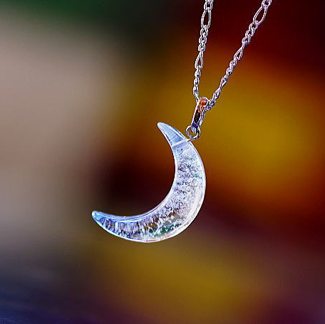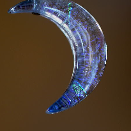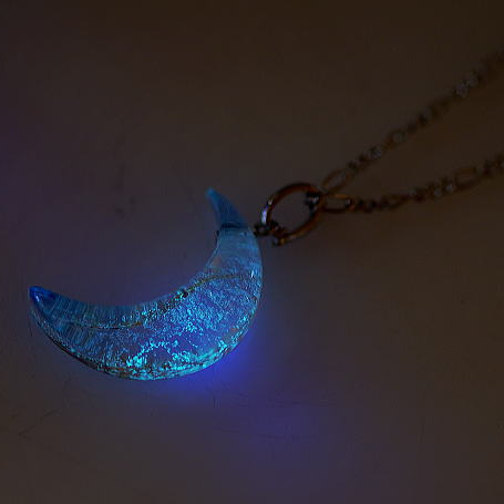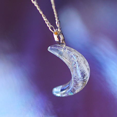 粉雪が舞うような繊細な煌き。三日月タイプのオリジナルペンダントが完成いたしました。クリアーベースの色合いの中にラメと「ダイクロ偏光ガラス」の煌きを施しました、暗闇でもお楽しみいただける逸品です。