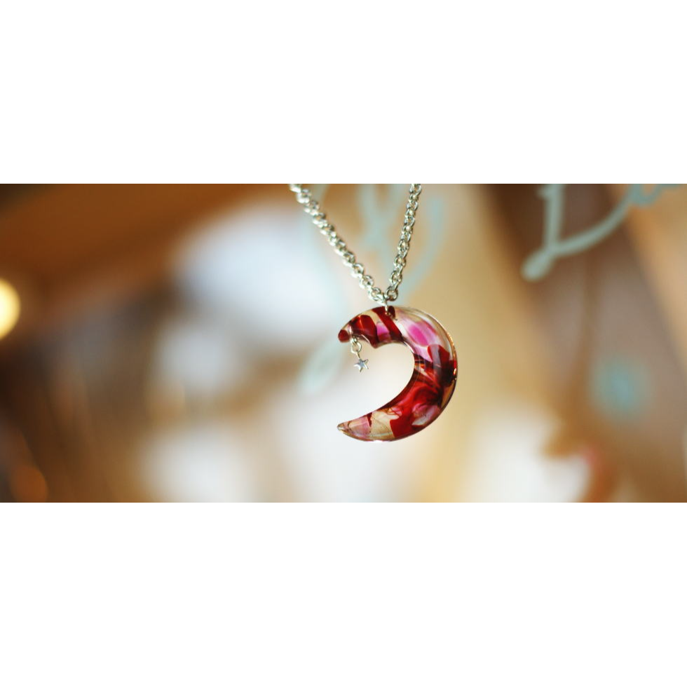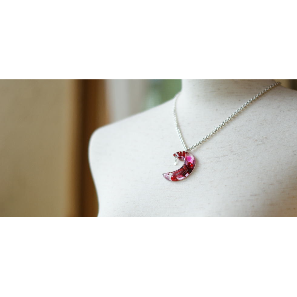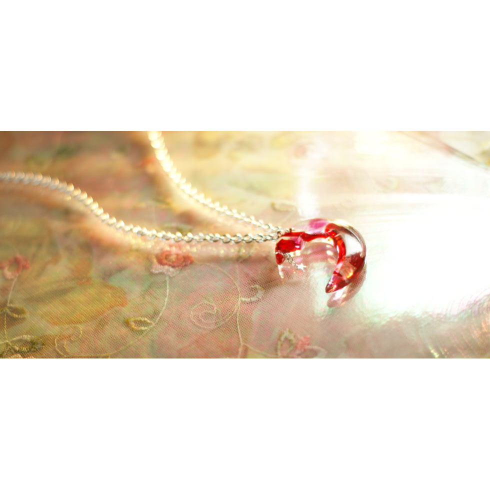三日月型のフォルムの内径には、ハートのフォルムが可愛く施されたファンタジックなイメージのペンダントです。先端からは小さなプチスターチャームSV製が可愛らしく揺れています。ワインレッド、赤系の色合いを大胆にマーブル模様にしたデザインペンダント!贈り物に素敵です