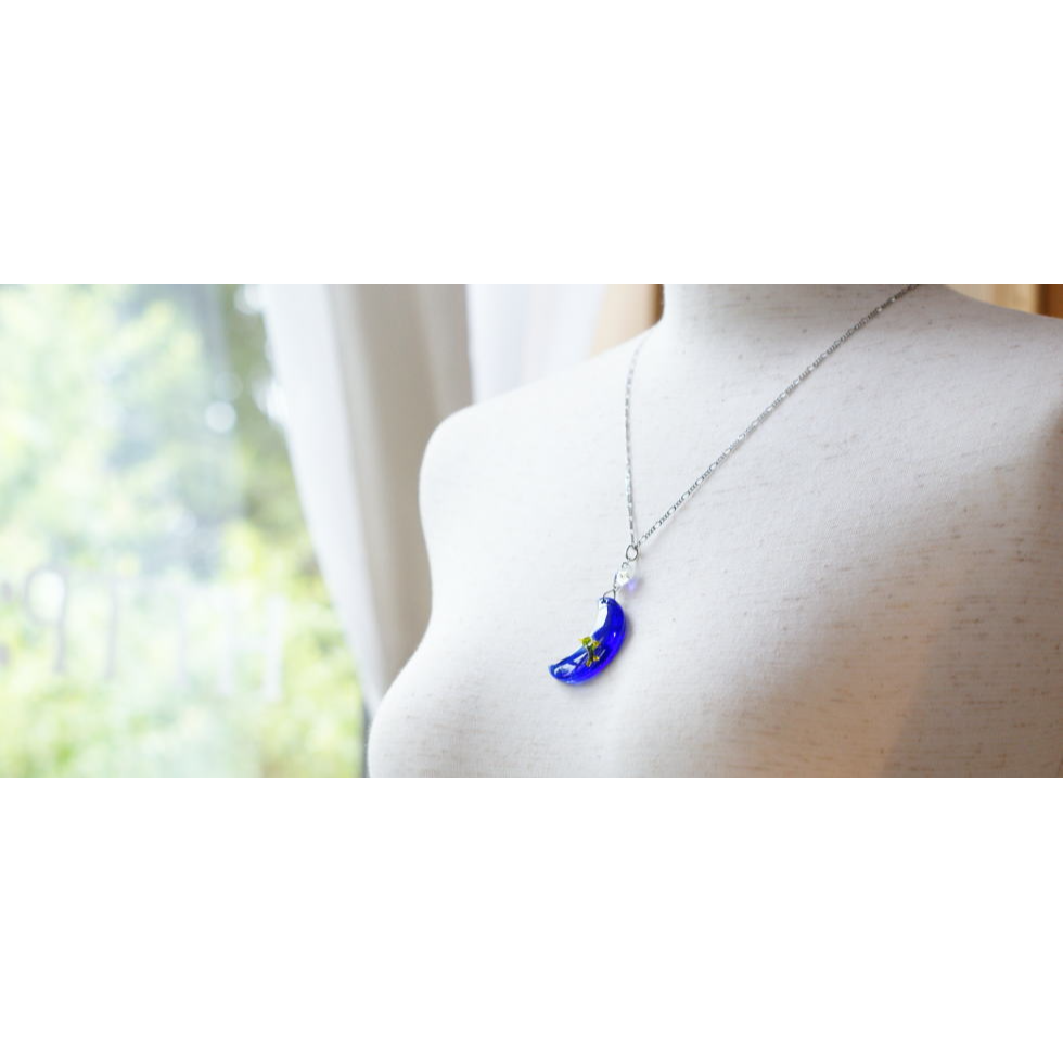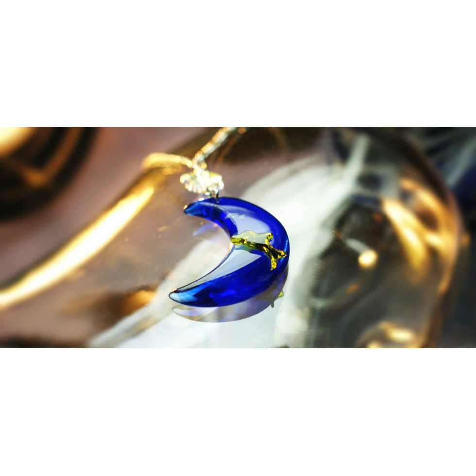 深海の海には穏やかな世界が広がり、そこには多くの生命が生まれ育まれています。そんな神秘な海の世界を三日月に表現してみました。コバルト(ロイヤル)ブルーベースに濃淡の色合いを加えました。淡いブルーの波が静かに寄せて、そこにはイルカが泳いでいます。童話のワンシーンを思わせる様な素敵なペンダントです。