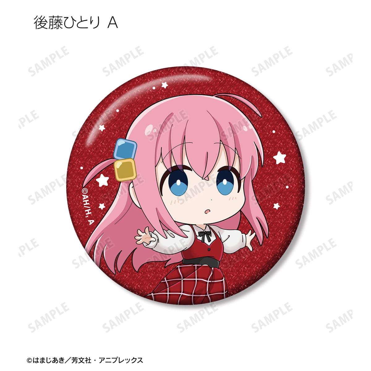 後藤ひとり、伊地知虹夏、山田リョウ、喜多郁代、伊地知星歌、PAさん、廣井きくり、後藤ふたり、岩下志麻、清水イライザの描き起こしちびキャライラストをグリッター加工を施した缶バッジに仕上げました。