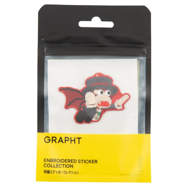 シルクハットとコウモリの羽のマントを身にまとい、吸血鬼のように空を飛ぶピポサルを刺繍で表現しました。