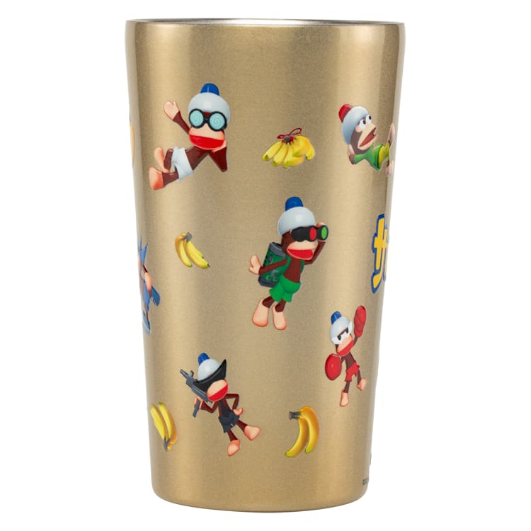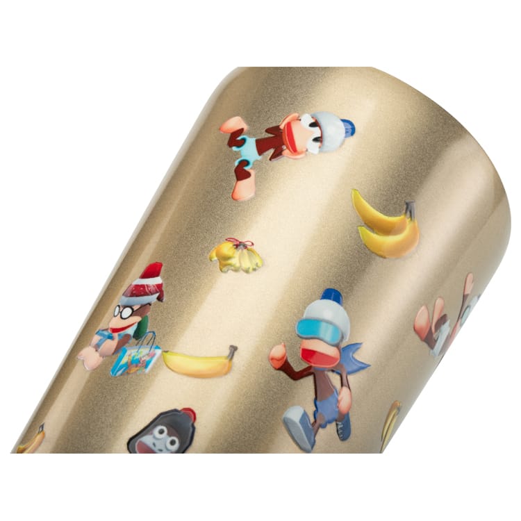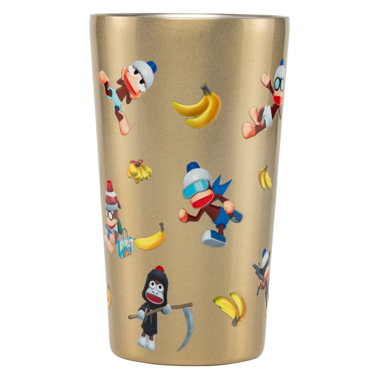 いろいろなシーンやコスチュームのピポサルたちを全面にプリントした、ゴールドのステンレスサーモタンブラー450mlタイプです。真空二層構造で保冷保温機能があるため、長時間適温で飲み物を楽しむことができます。
