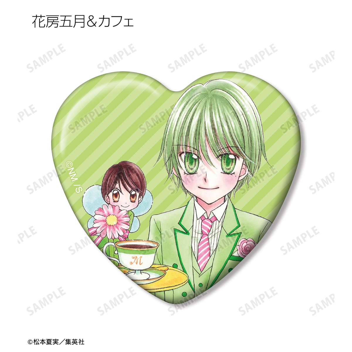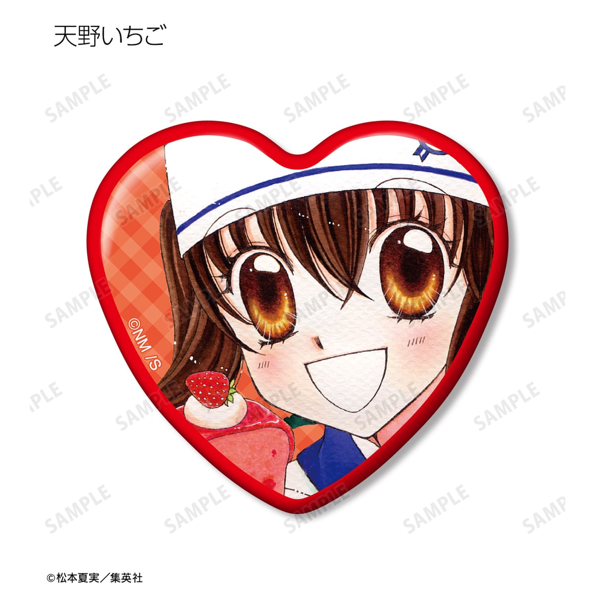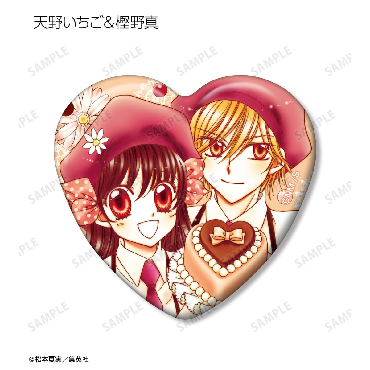 天野いちご、樫野真、安堂千乃介、花房五月、バニラ、ショコラ、キャラメル、カフェの原作イラストをハート型の缶バッジに仕上げました。