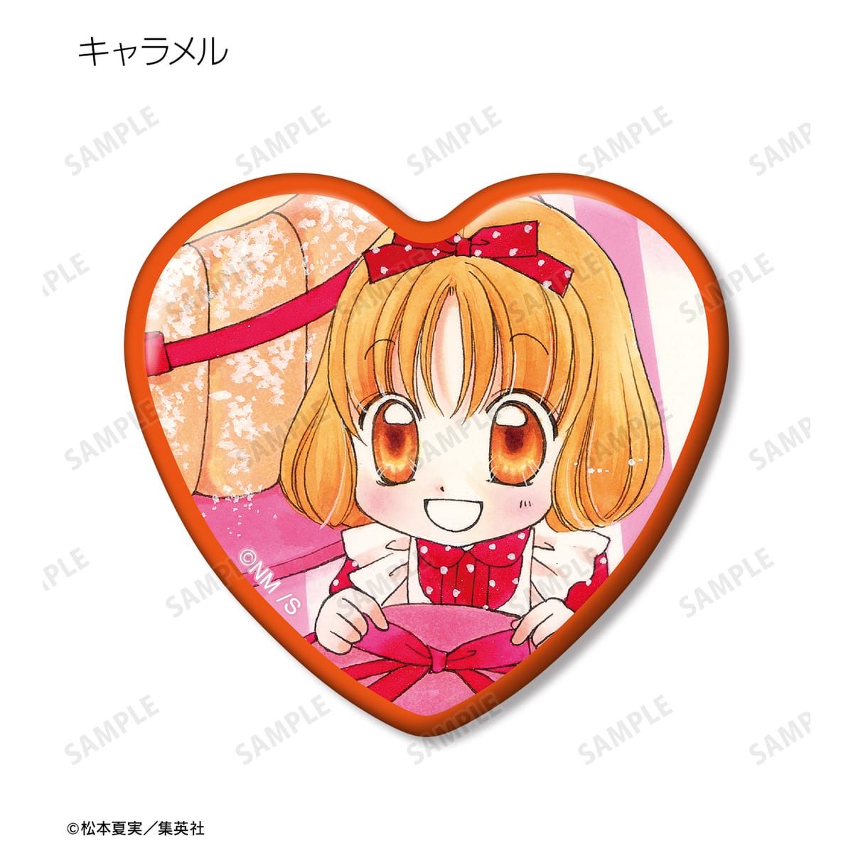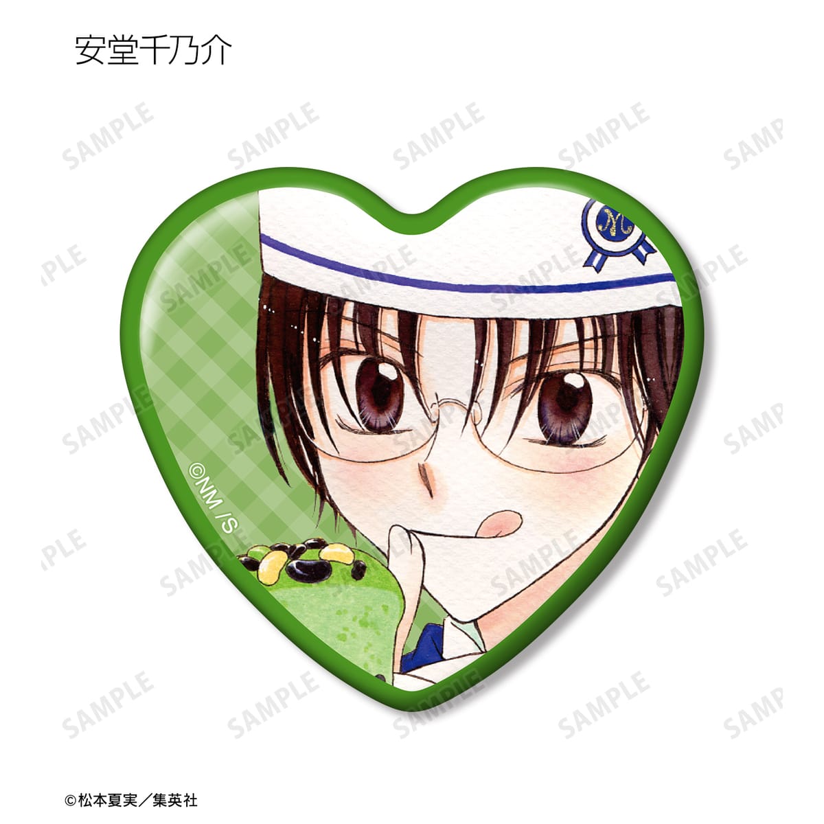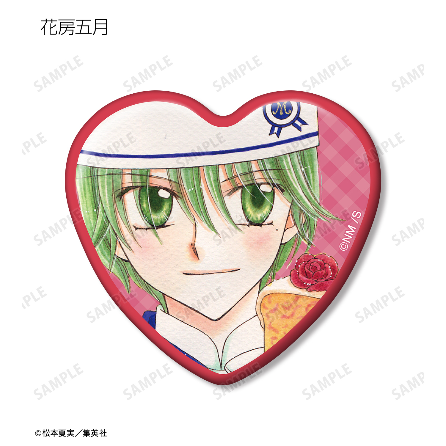 天野いちご、樫野真、安堂千乃介、花房五月、バニラ、ショコラ、キャラメル、カフェの原作イラストをハート型の缶バッジに仕上げました。