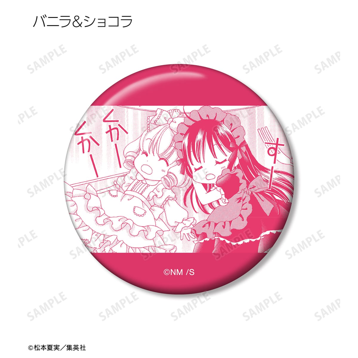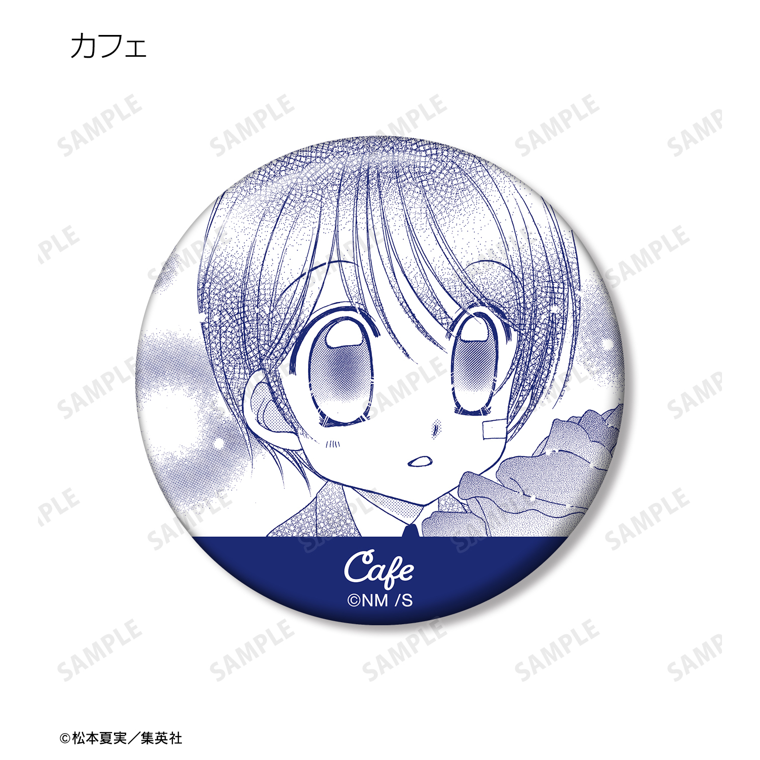 天野いちご、樫野真、安堂千乃介、花房五月、バニラ、ショコラ、キャラメル、カフェの原作コマイラストを缶バッジに仕上げました。
