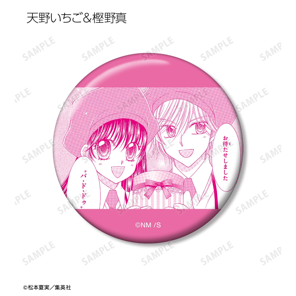 天野いちご、樫野真、安堂千乃介、花房五月、バニラ、ショコラ、キャラメル、カフェの原作コマイラストを缶バッジに仕上げました。