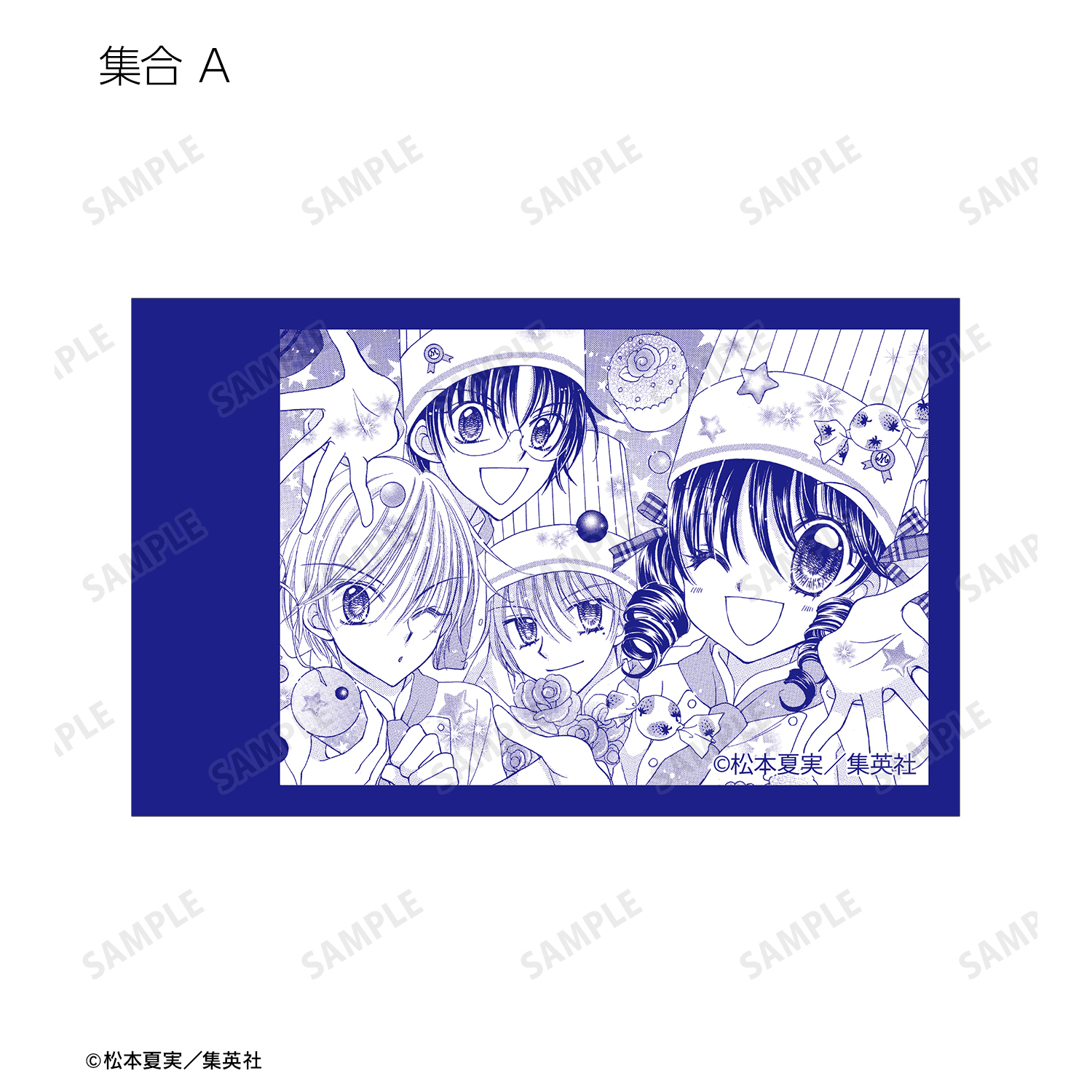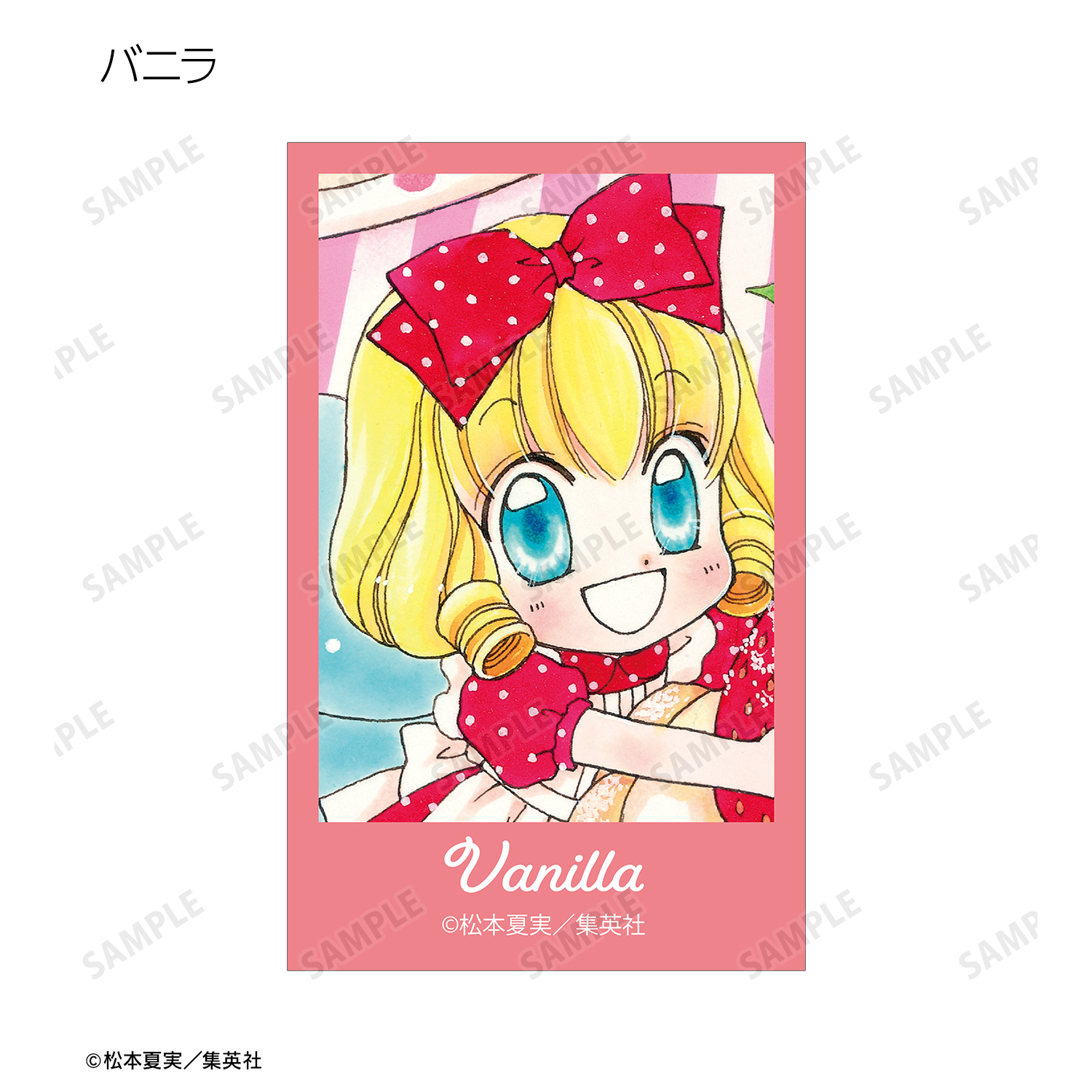 天野いちご、樫野真、安堂千乃介、花房五月、バニラ、ショコラ、キャラメル、カフェの原作イラスト、原作コマイラストをインスタントカメラ風のイラストカードに仕上げました。