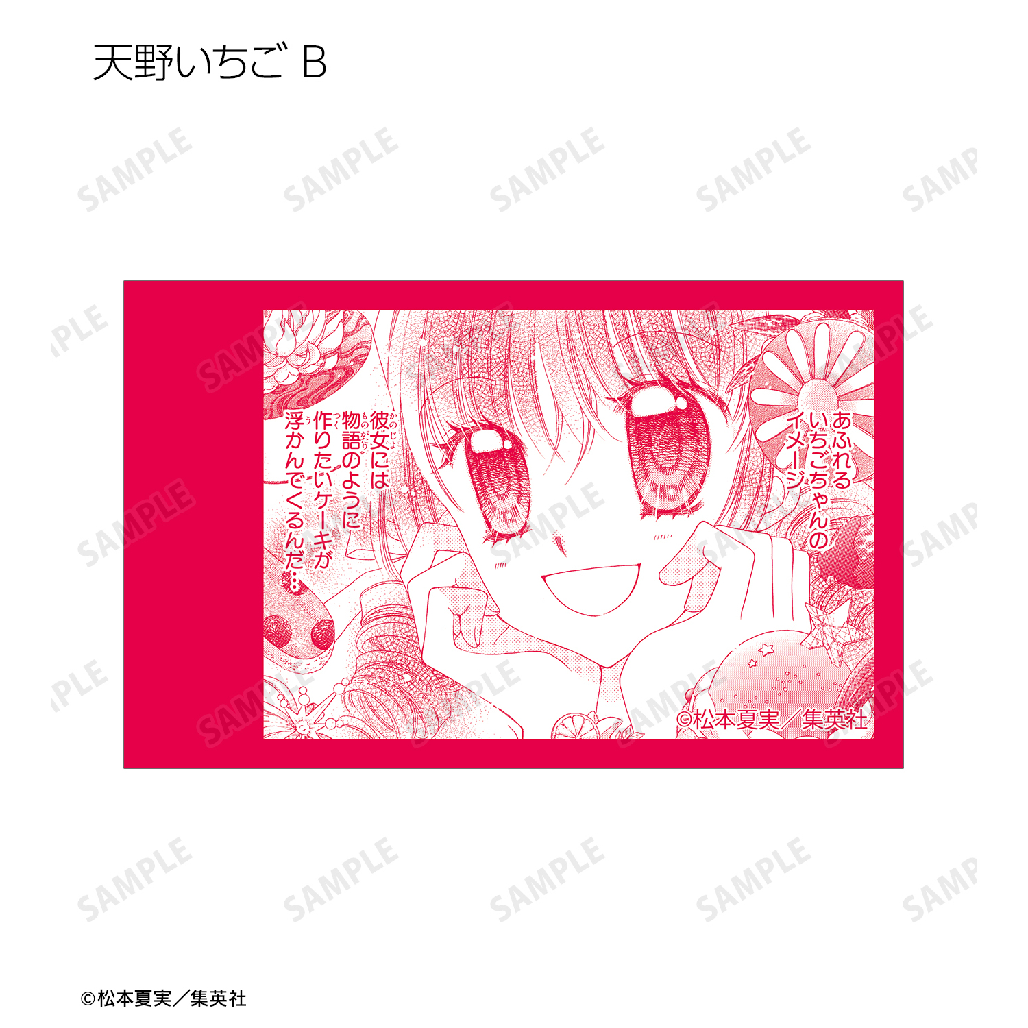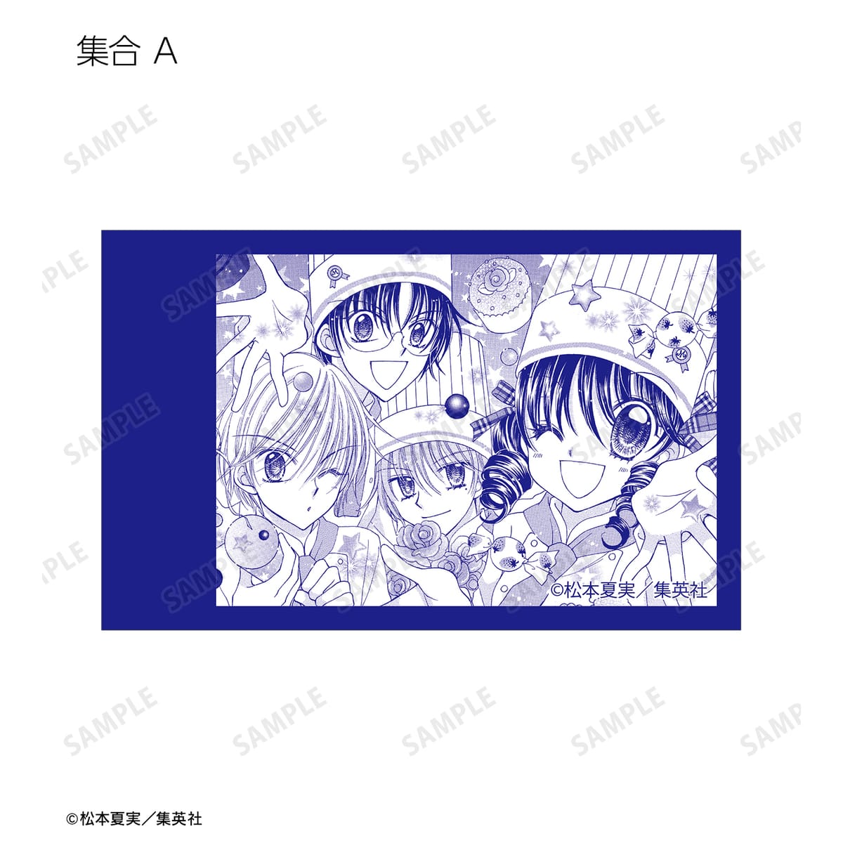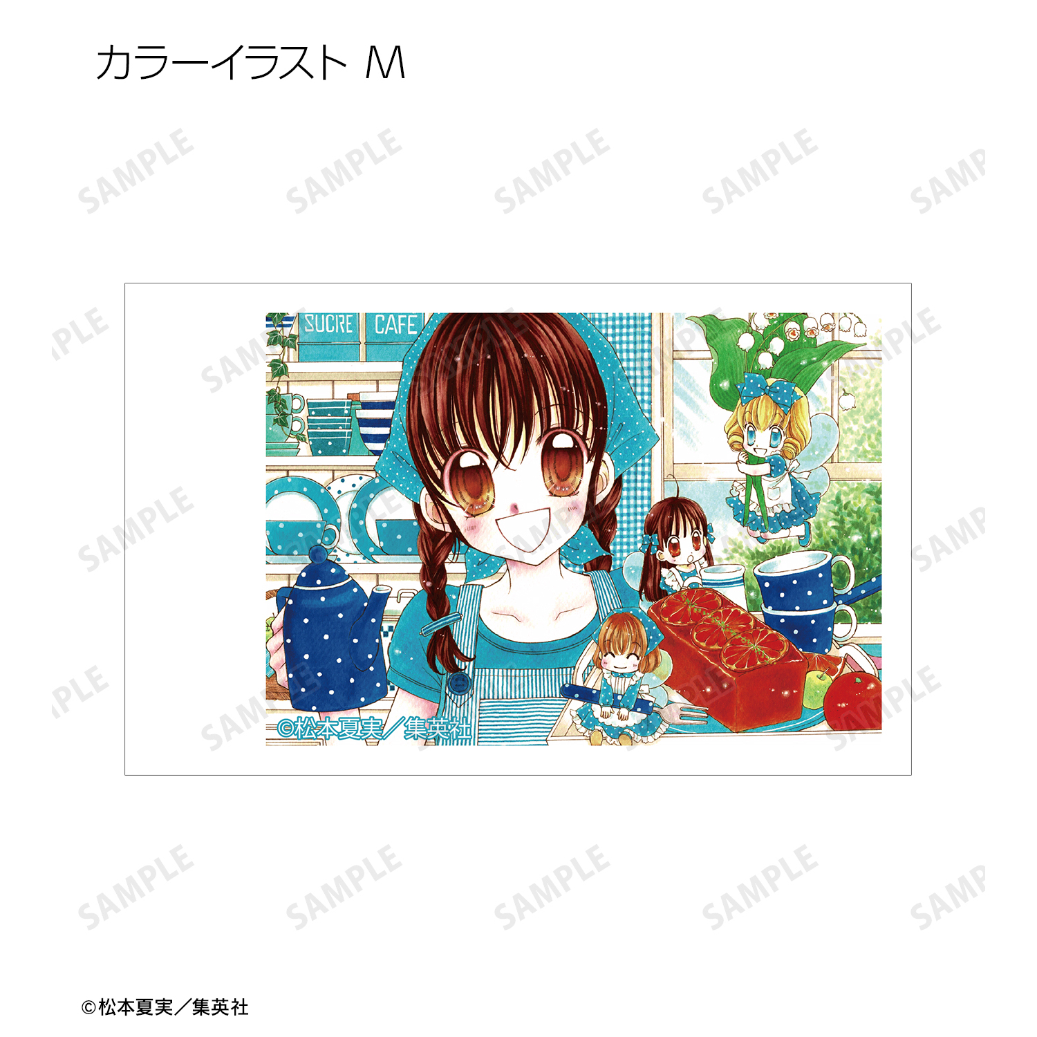 天野いちご、樫野真、安堂千乃介、花房五月、バニラ、ショコラ、キャラメル、カフェの原作イラスト、原作コマイラストをインスタントカメラ風のイラストカードに仕上げました。