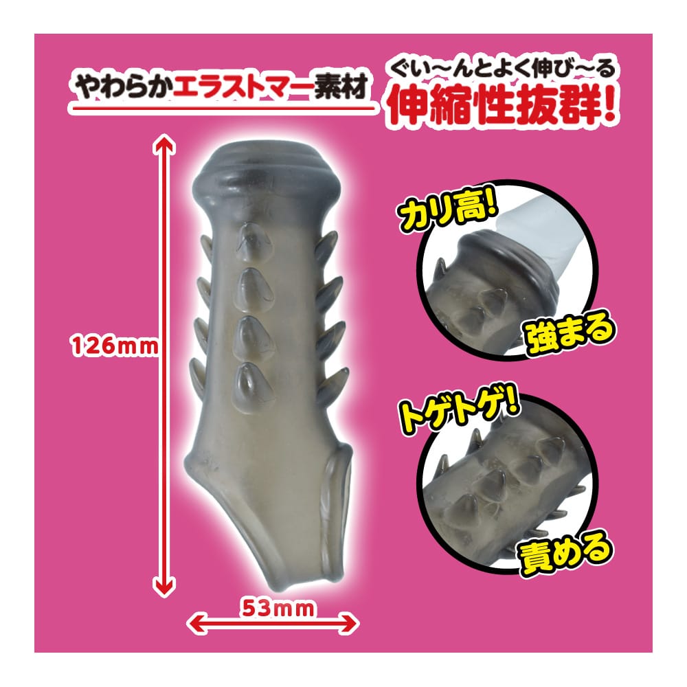 夜もがんばリング、で大人気のやわらかメンズリング「ち●こリング」シリーズに、スーパーなサックが新登場!今度のち●こサックは「カ●首&トゲトゲが付いたメンズサック」!立体感のある凹凸造形が、他にはないスーパーな快感を生み出します!ぷにぷにっとした柔らかなTPE(エラストマー)素材は、ぐい~んとよく伸びる高伸縮性!サイズ問わずでどんな大きさでもしっかりフィットの抜群の装着感&締付感!男らしさを引き立たせるスモークカラー!「カ●&トゲ」は、カ●首の強化となる造形と、アグレッシブなトゲトゲ配置!先端部の膨らみは、カ●首をパワフルに!全16本もあるトゲトゲは、攻撃的な快感に!アナタをスーパーに変身させるはず!ほとばしるストロング、みなぎるパワー!