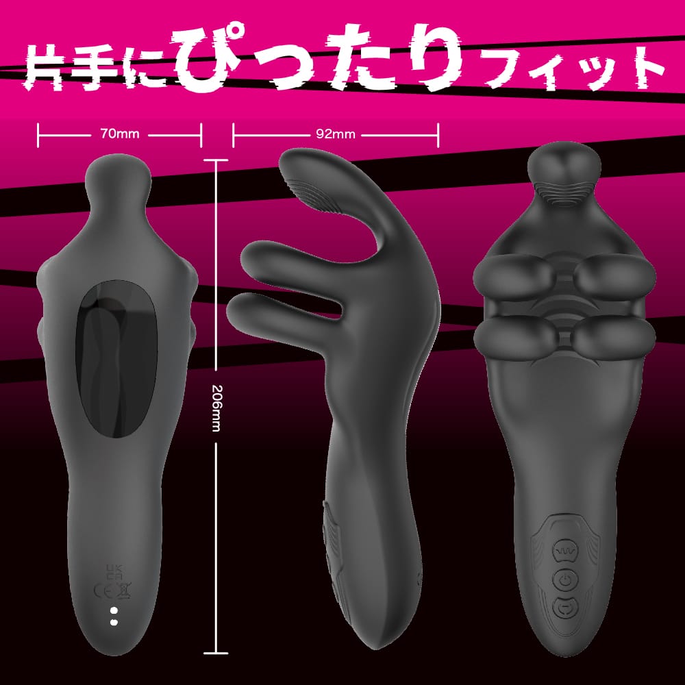 【多種多様な刺激で悶絶】5本の指が理性を削ぎ落とす!振動しながら揉みしだく快感を体感せよ!多様な振動はなんと10段階。好みの強さで振動させることができます。さらに、10段階の揉み仕様も追加。複雑な動きであなたを快感の極地へ導きます!【鷲掴みの圧迫、強烈振動と激烈揉み】どんなサイズにもピッタリフィット。快感はあなたを絶対に逃さない。1本が先端を圧迫!残りの4本はさ●を掴んで全体に刺激を伝えます。【使用後もラクラクIPX6生活防水】使用後も水洗いできて清潔。洗浄に手間はかかりません。【画期的な充電システム】磁気充電でコンパクト。さっと充電できるので手間なしラクラク。