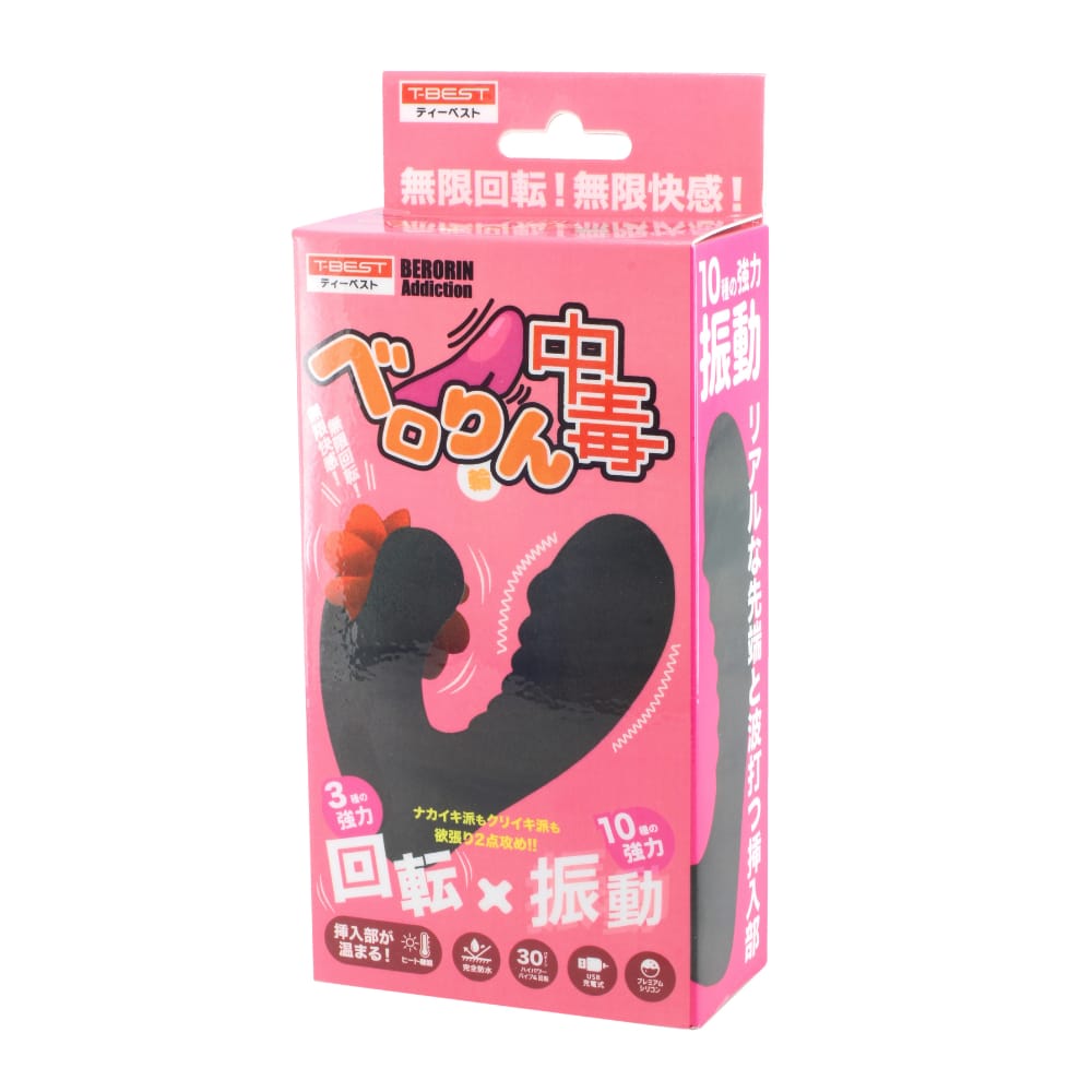 3種の強力回転と10種の強力振動。ナカイキ派もク●イキ派も満足の欲張り2点攻め!ベロりん中毒はク●ニとGス●ット刺激を同時に刺激するハイクオリティーバイブ。それぞれ単体でも使用が出来ますが、同時攻めで無限の快感が押し寄せます。風車のように回転する舌はやわらかいシリコンで出来ていて、無限にク●ト●スを舐めまわします。舐めパターンは3種類あり、好みで選んで使用が可能。リアルな先端は挿入感にこだわり、波打つ挿入部はGス●ットを強力振動で刺激します。挿入部はヒート機能が搭載されているので、人肌程度まで温まり、よりリアルさを追求しています。挿入時に暖かいと感じる本物志向のバイブです。操作はそれぞれセパレートのボタンなので、お好みの回転と振動をたのしんでください。プレミアムシリコンを使用し、肌触りもスベスベ。完全防水なので水洗い可能。水洗い後はタオルなどでしっかりと水気を取ってください。
