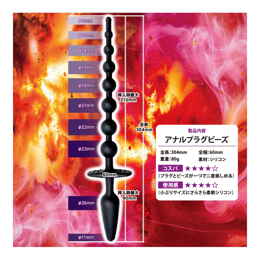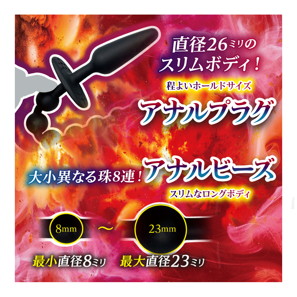「ア●ルプラグ」と「ア●ルビーズ」が一つになった!一つで二種類楽しめる、コスパ抜群のア●ルグッズがここに登場!片方は、太さ26ミリと小ぶりなストッパーの「ア●ルプラグ」。もう片方は、大小8珠が連なるストレートボディの「ア●ルビーズ」。異なるア●ルグッズがこれひとつで楽しめる、幅広いプレイバリューに溢れたアイテムです! 「ア●ルプラグ」は、初めてでも嬉しいスリムサイズ。ストッパー部分には、グリップ凹凸付きのワイドタイプです。「ア●ルビーズ」は、直径8~23ミリの大小サイズが異なる8珠モデル。ベーシックなストレート形状となるスタンダードタイプです。 本体素材には、キメ細かくサラサラ質感の高品質シリコン素材を採用。柔軟でよく曲がるだけでなく、水洗い可能でメンテナンスも簡単です。 プラグとビーズの夢の共演、双極合体による悶絶快感をお楽しみください!