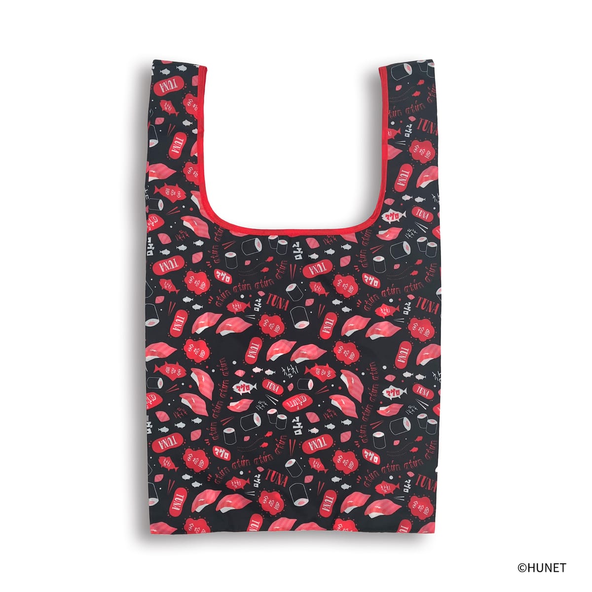 リアルなプリントを施したポーチにおさかなテーマの総柄プリントが入ったエコバッグを収納できます。