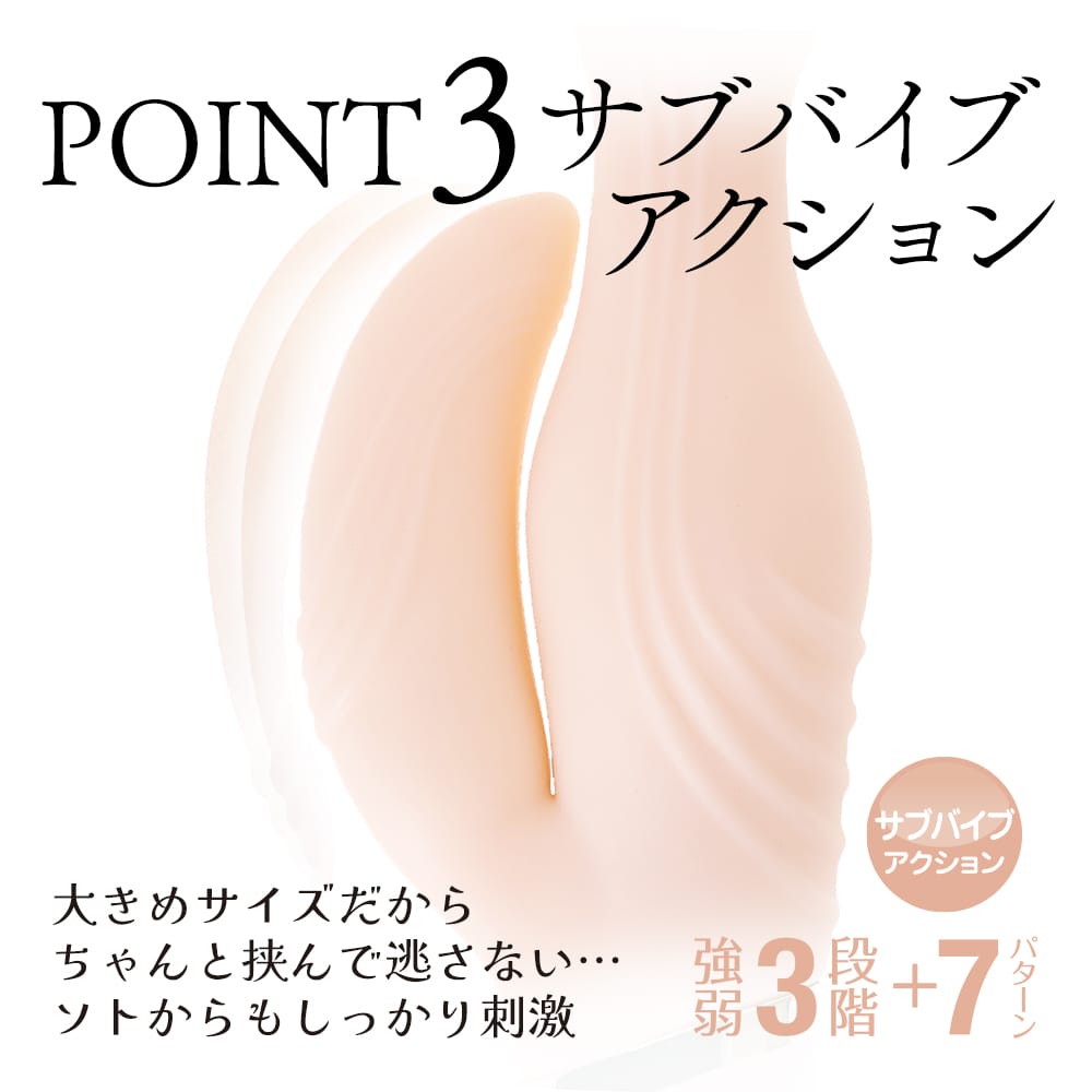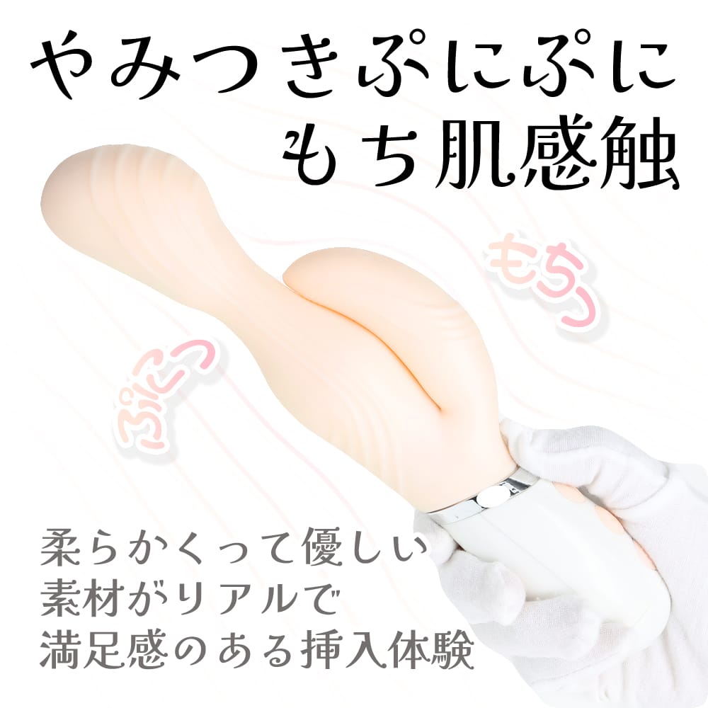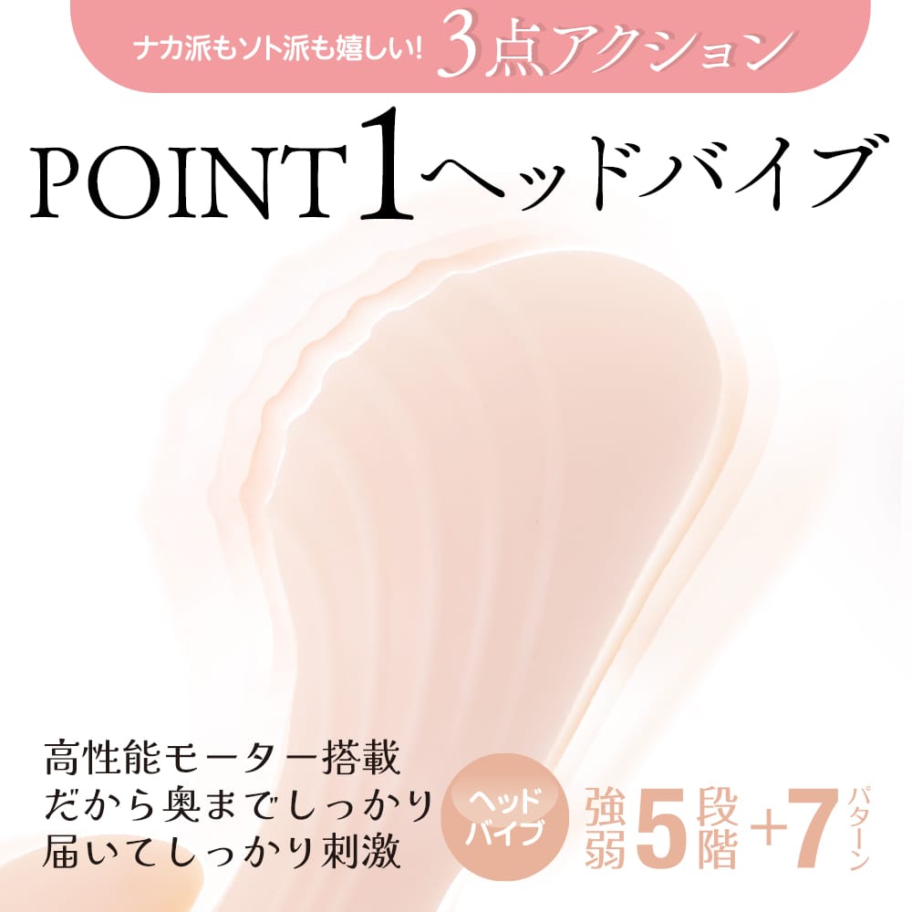 モチ肌感触がクセになる、柔らか高品質素材採用バイブ。スイング+高性能ヘッドモーター搭載だからナカ派も大満足。しっかりと擦れる快感を楽しめる形状のサブバイブにもパワフルモーターを搭載しています。不思議な感触の柔らか素材が優しい気持ち良さを演出します。ヘッドバイブは強弱を細かく5段階調整+実用性の高い7パターンを採用、計12パターン+スイングアクション7パターン+サブバイブも10パターンもあるのでお好みの刺激を選んで楽しめます。満たされ感の強い先端形状とG部分にも膨らみを付けて、より充実した挿入感を実現しました。実用的なアクションと挿入感に特化した形状と高品質柔性素材の全部盛りバイブです。