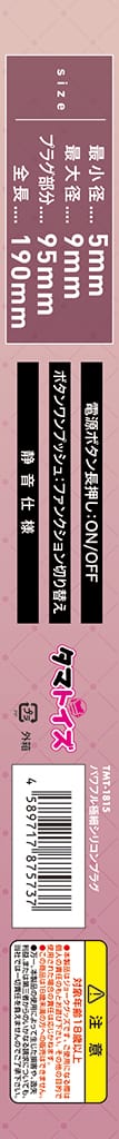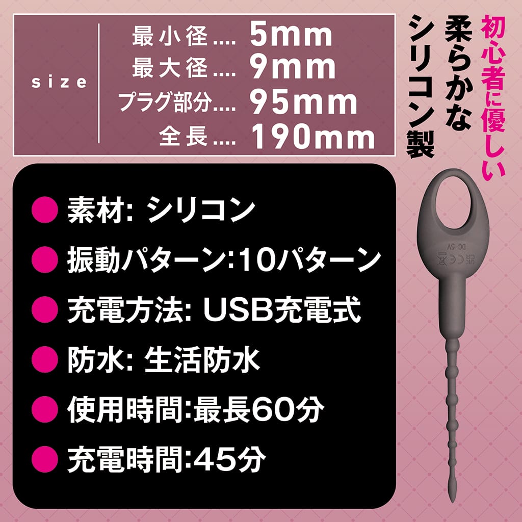 最小径:5mm 最大径:9mm プラグ部分:95mm 全長:190mm ●素材:シリコン ●振動パターン:10パターン ●充電方法: USB充電式 ●防水: 生活防水 ●使用時間:最長60分 ●充電時間:45分 本体、USB充電ケーブル