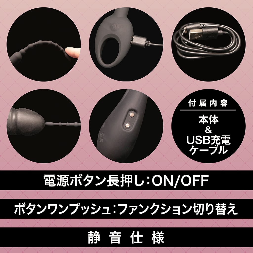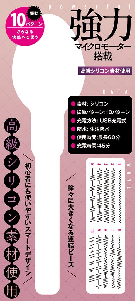 強力マイクロモーター搭載 10パターン振動がさらなる快感へと誘う 高級シリコン素材使用 初心者に優しい柔らかなシリコン製 高級シリコン素材が生み出すソフトな質感 初心者にも使いやすいスマートデザイン 徐々に大きくなる連結ビーズ 最小径:5mm 最大径:9mm プラグ部分:95mm 全長:190mm 電源ボタン長押し:ON/OFF ボタンワンプッシュ:ファンクション切り替え 静音仕様 ●素材:シリコン ●振動パターン:10パターン ●充電方法: USB充電式 ●防水: 生活防水 ●使用時間:最長60分 ●充電時間:45分 本体、USB充電ケーブル