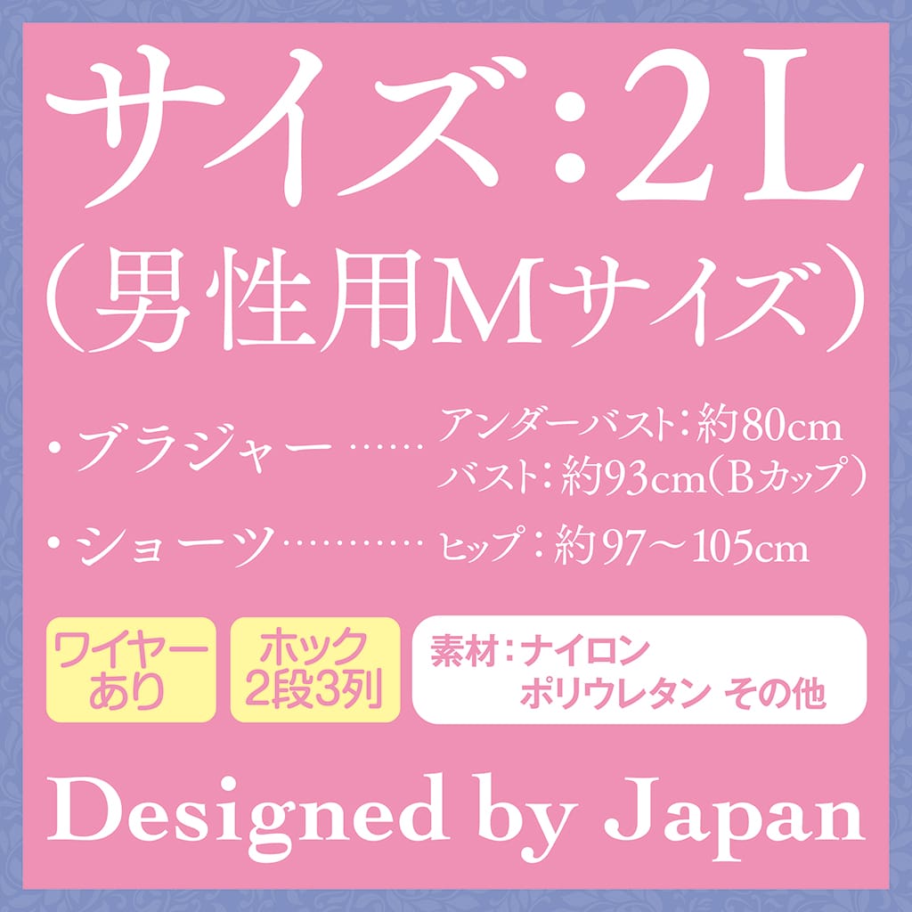 ◆サイズ2L(男性用Mサイズ) 【ブラジャー】アンダーバスト:約80cm バスト:約93cm カップ:Bカップ 【ショーツ】ヒップ:約97~約105cm 素材:ナイロン ポリウレタン その他
