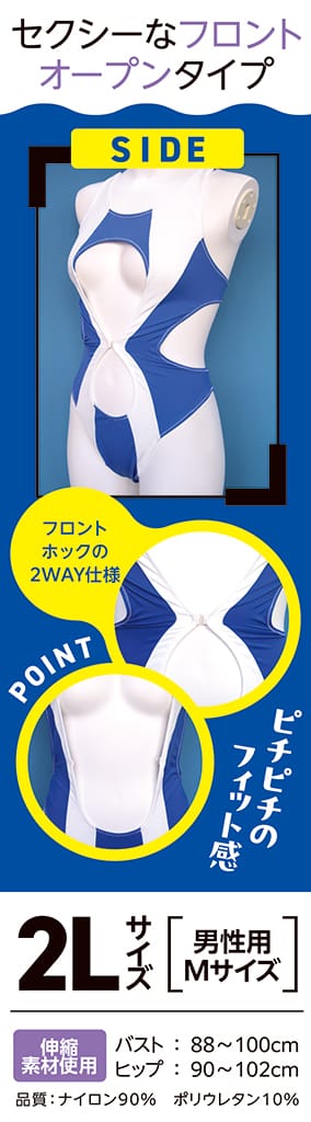 セクシーなフロントオープンタイプ フロントホックの2WAY仕様 ホワイト×ブールのスポーティなデザイン ツルツルした感触がたまらない! ピチピチのフィット感 最高の着心地が体験できる 伸縮性抜群! 2Lサイズ(男性用Mサイズ) 伸縮素材使用 バスト 88?100cm ヒップ 90?102cm 品質:ナイロン90% ポリウレタン10%