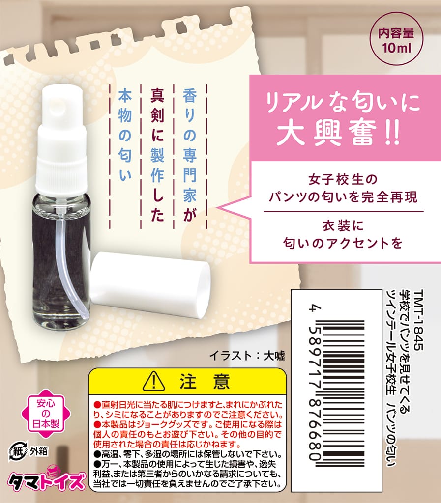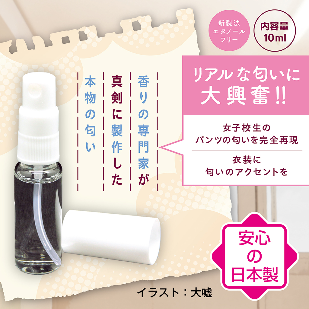 新製法エタノールフリー 女子校生のパンツの匂いを完全再現 リアルな匂いに大興奮!! 発情した女子校生の濃厚な匂い 女性フェロモンたっぷりの淫臭 匂いで感じる新感覚 あのとき感じたあの匂いをもう一度 女性の特有の匂いを詰め込んだ香りグッツ 衣装に匂いのアクセントを 内容量10ml 香りの専門家が真剣に製作した本物の匂い 日本製 イラスト:大嘘