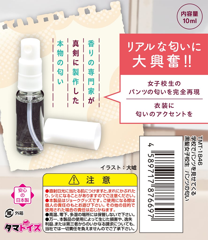 新製法エタノールフリー 女子校生のパンツの匂いを完全再現 リアルな匂いに大興奮!! 発情した女子校生の濃厚な匂い 女性フェロモンたっぷりの淫臭 匂いで感じる新感覚 あのとき感じたあの匂いをもう一度 女性の特有の匂いを詰め込んだ香りグッツ 衣装に匂いのアクセントを 内容量10ml 香りの専門家が真剣に製作した本物の匂い 日本製 イラスト:大嘘