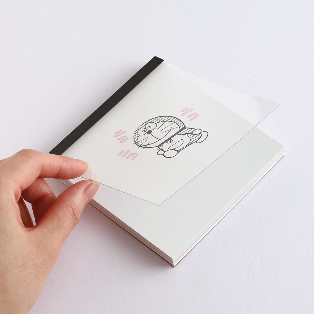 表紙はクリアタイプの硬質塩ビに樹脂盛り加工。中面の絵柄は4種類あり、ドラえもんたちの豊かな表情を楽しめます。(C)Fujiko-Pro